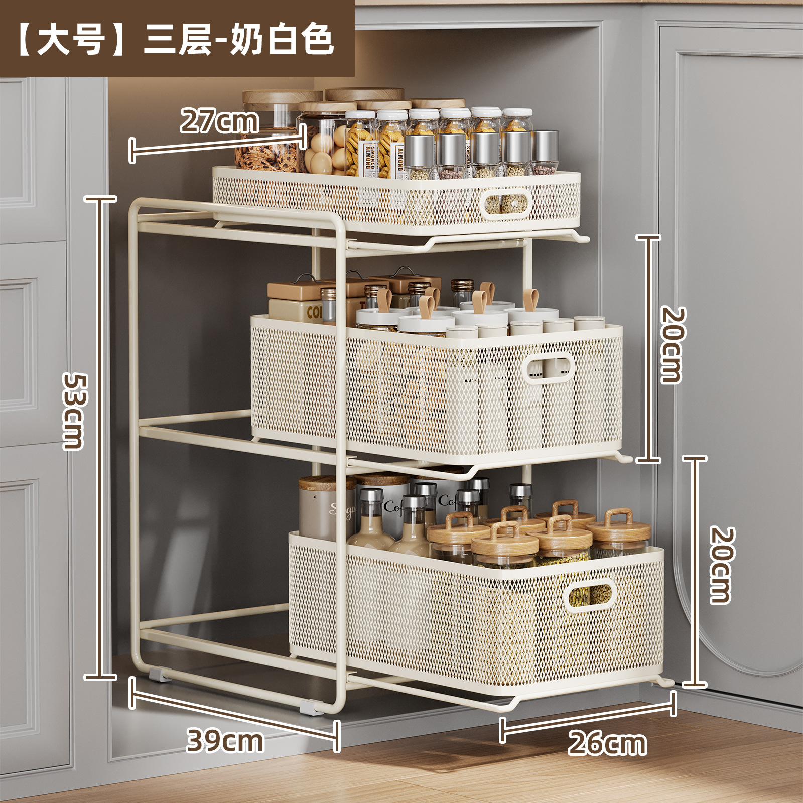 • [밀크화이트] 대형 3단 인출식 바구니 수납선반 [다이아몬드형]