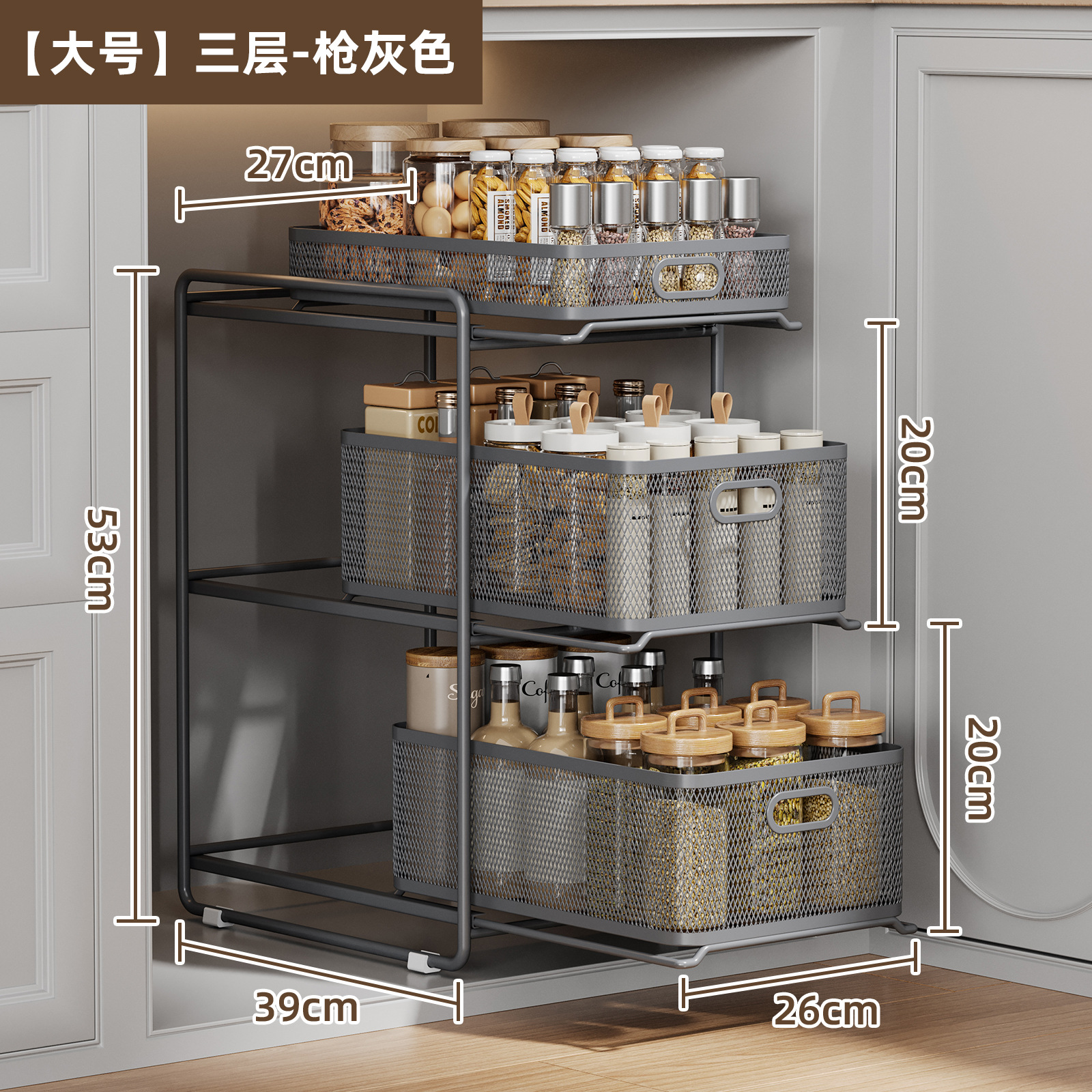 • [건그레이] 대형 3단 인출식 바구니 수납선반 [다이아몬드형]
