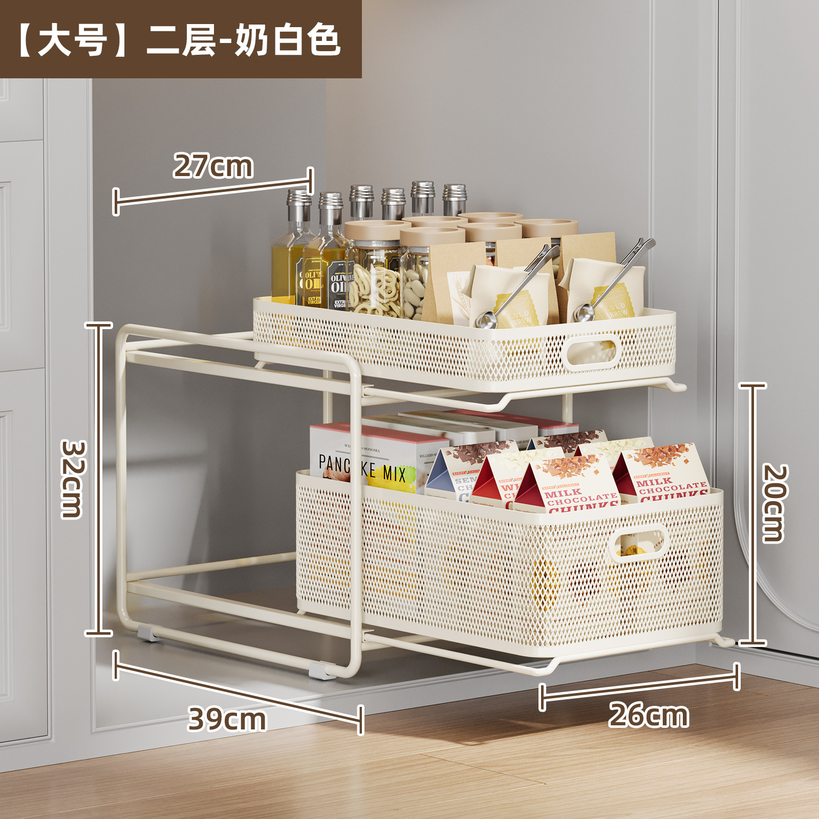 • [밀크화이트] 대형 2단 인출식 바구니 수납선반 [다이아몬드형]
