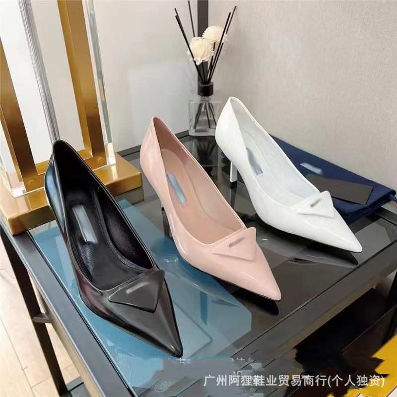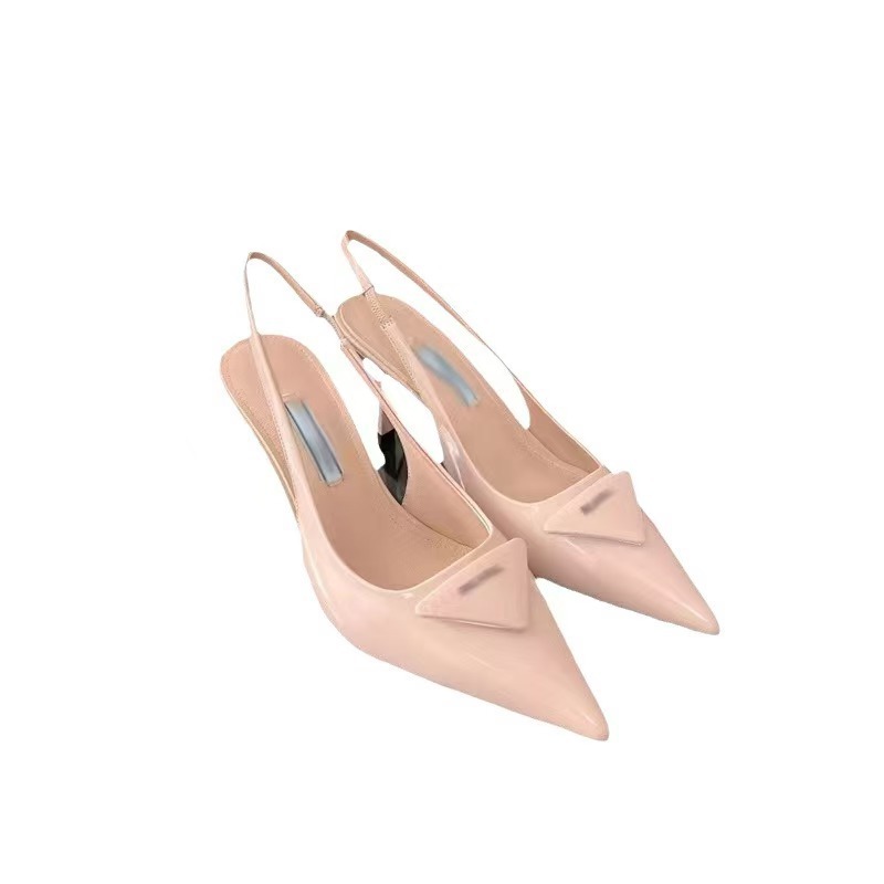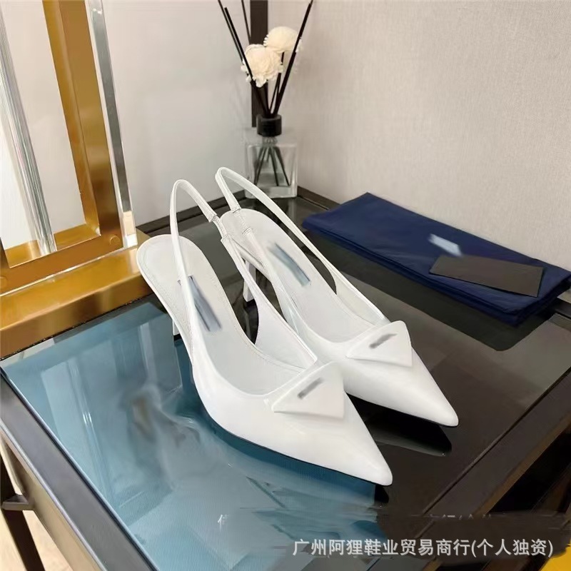 2024 여름 캣워크 모양의 하이힐 신발 삼각형 로고 뾰족한 가죽 커버 하이힐 기질 여신 스타일스토어 가기