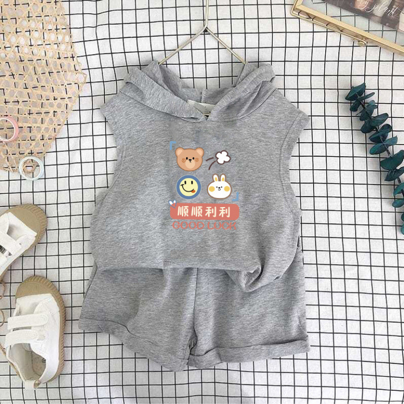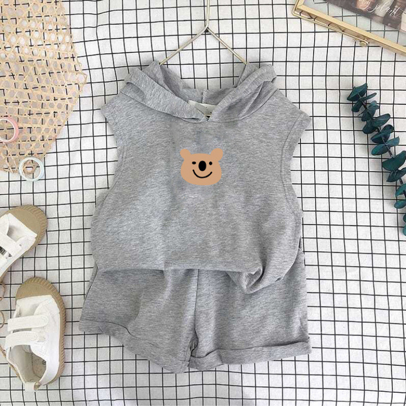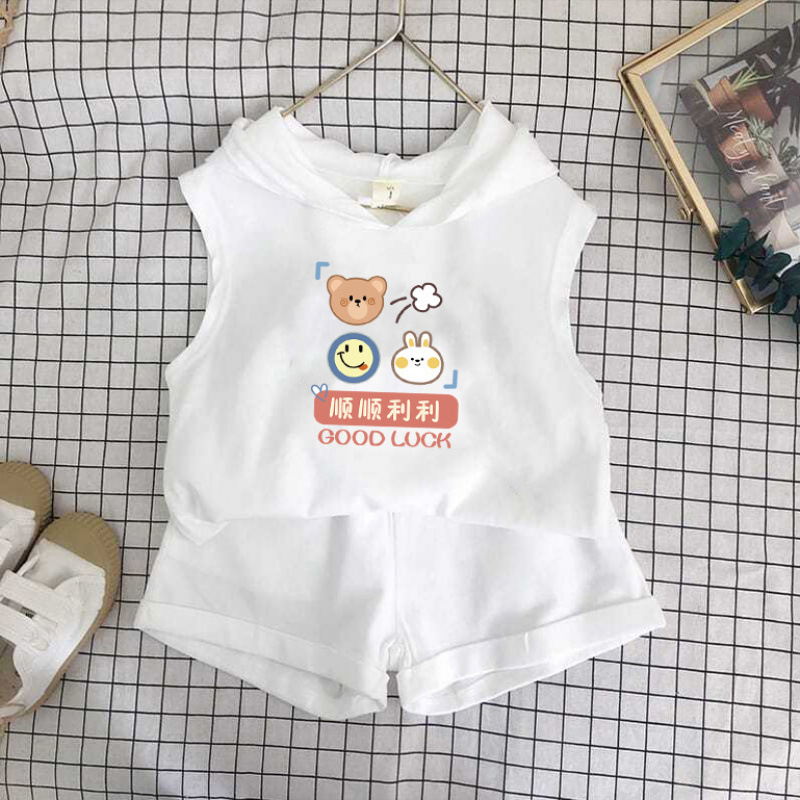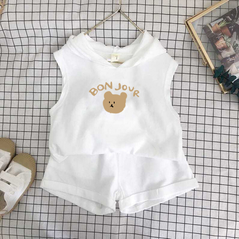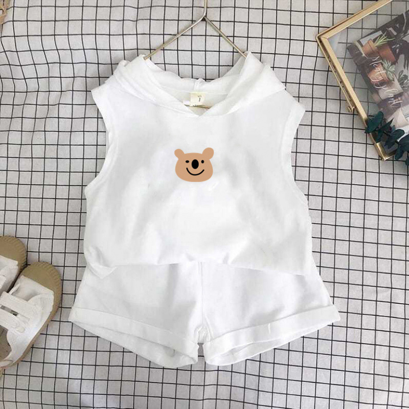 여름 세트 새로운 서양식 어린이 조끼 한국 스타일 민소매 소년과 소녀 아기 후드 반바지 인쇄 투피스 세트