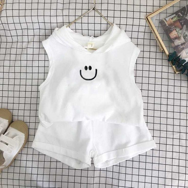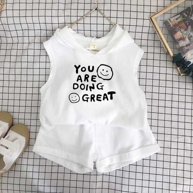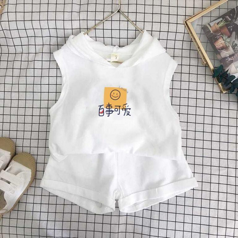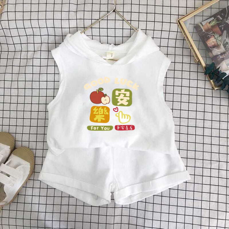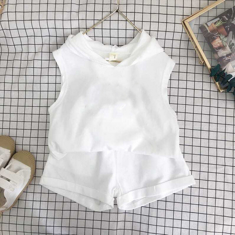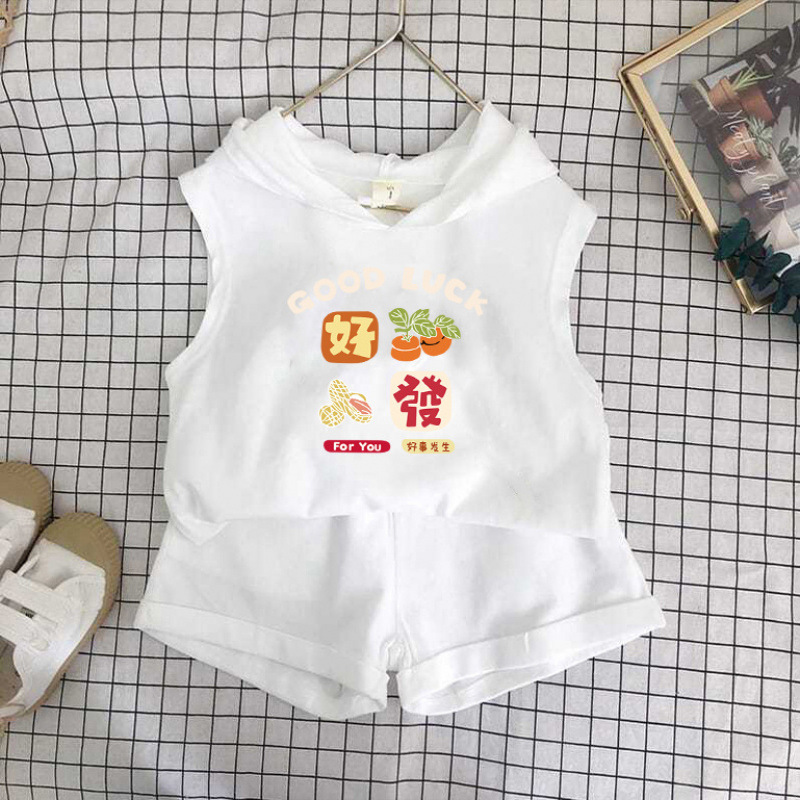 여름 세트 새로운 서양식 어린이 조끼 한국 스타일 민소매 소년과 소녀 아기 후드 반바지 인쇄 투피스 세트