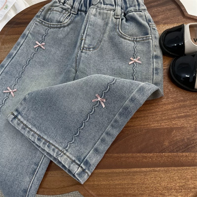 여아 청바지 가을 신작 2025 베이비 보우 소프트 데님 와이드 레그 캐주얼 롱 팬츠 아우터로 활용도 높음