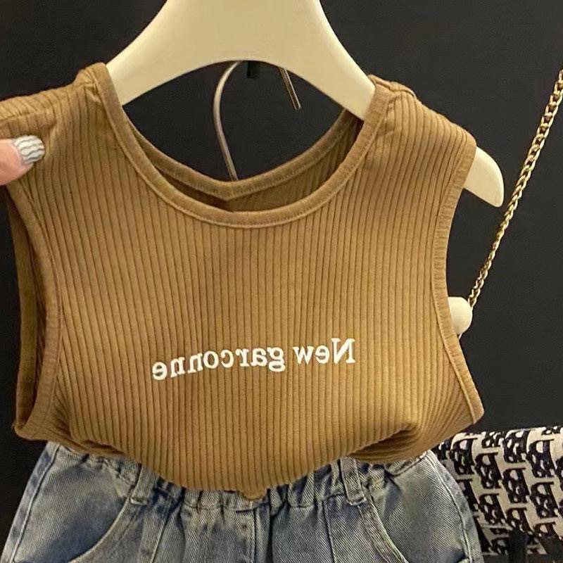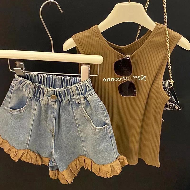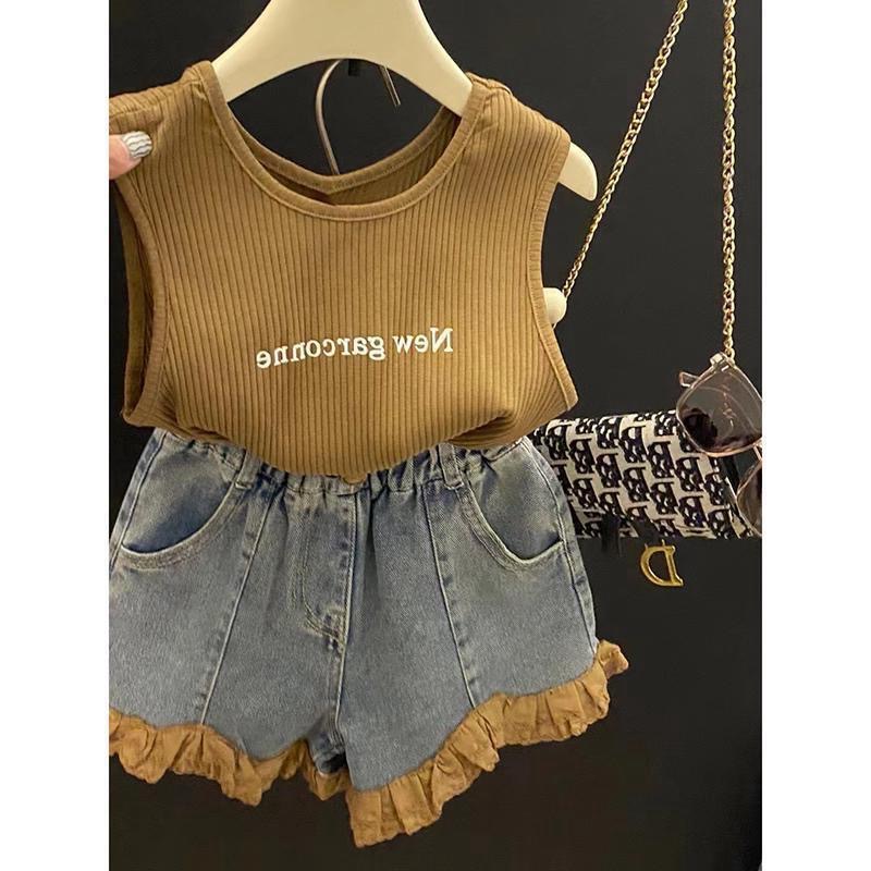 여자 인터넷 인기 세트 2025 여름 새 스타일 올 매치 편지 조끼 대조 레이스 청바지 투피스 세트스토어 가기