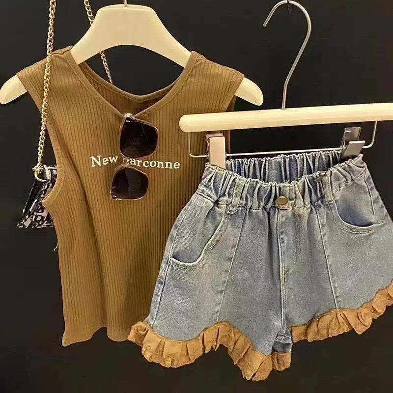여자 인터넷 인기 세트 2025 여름 새 스타일 올 매치 편지 조끼 대조 레이스 청바지 투피스 세트