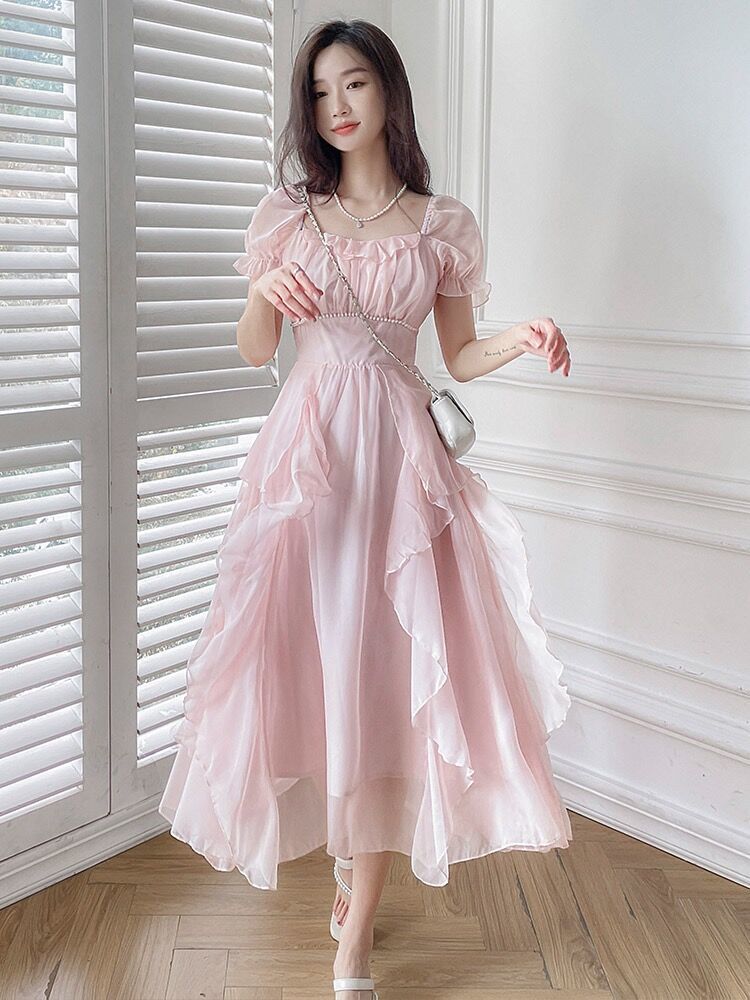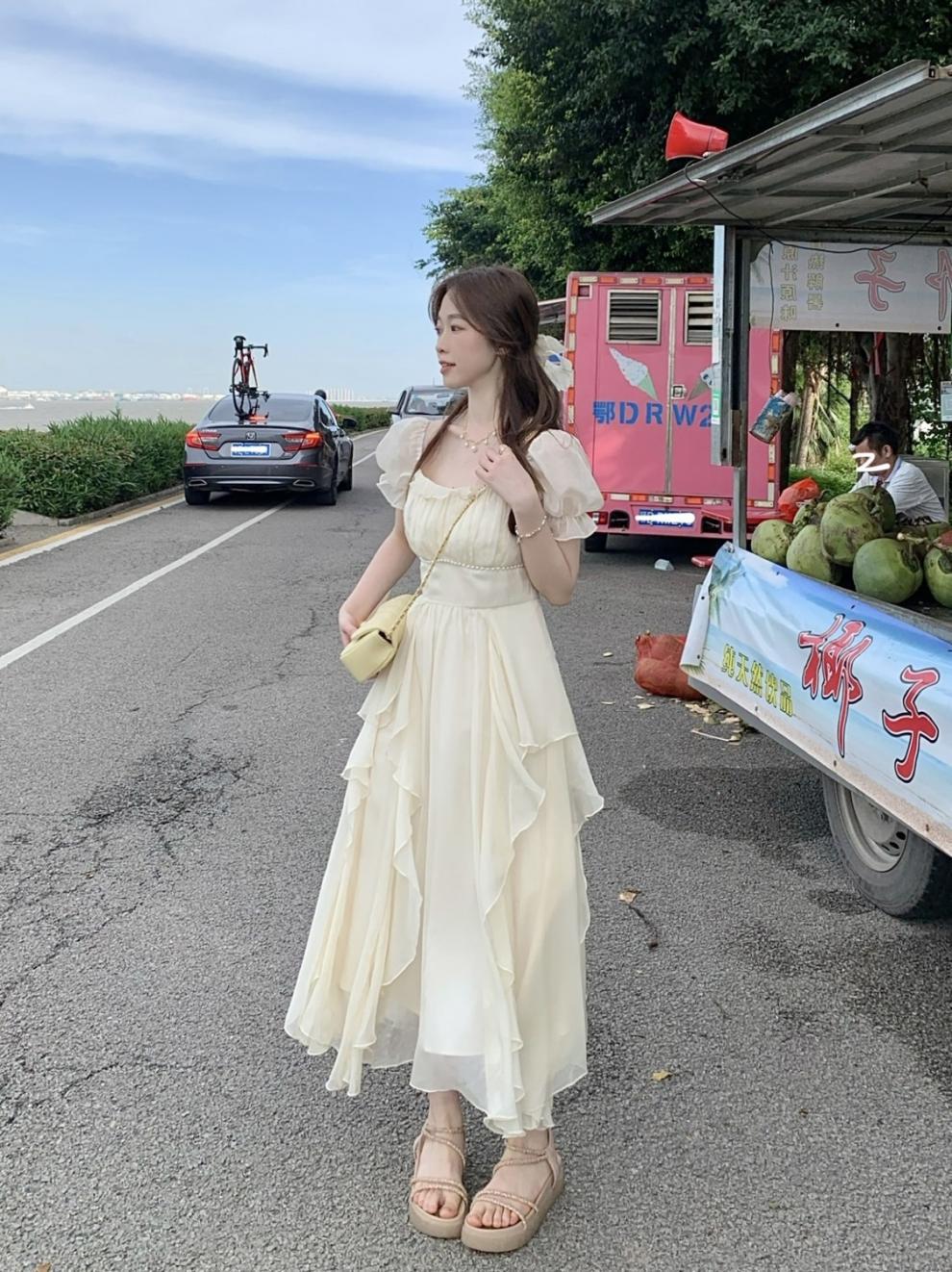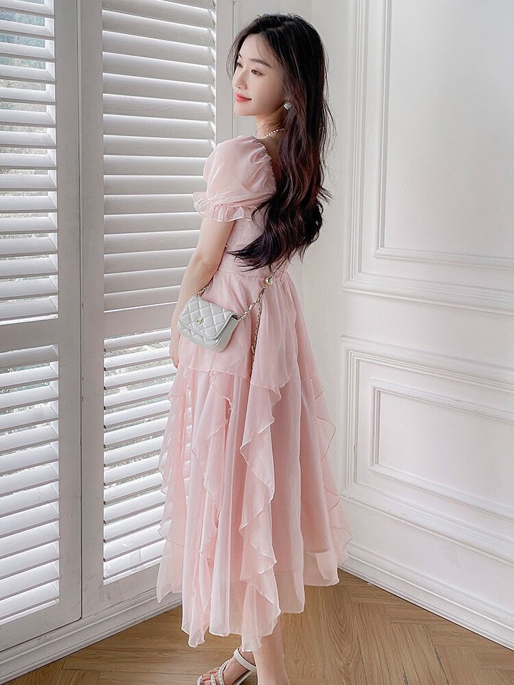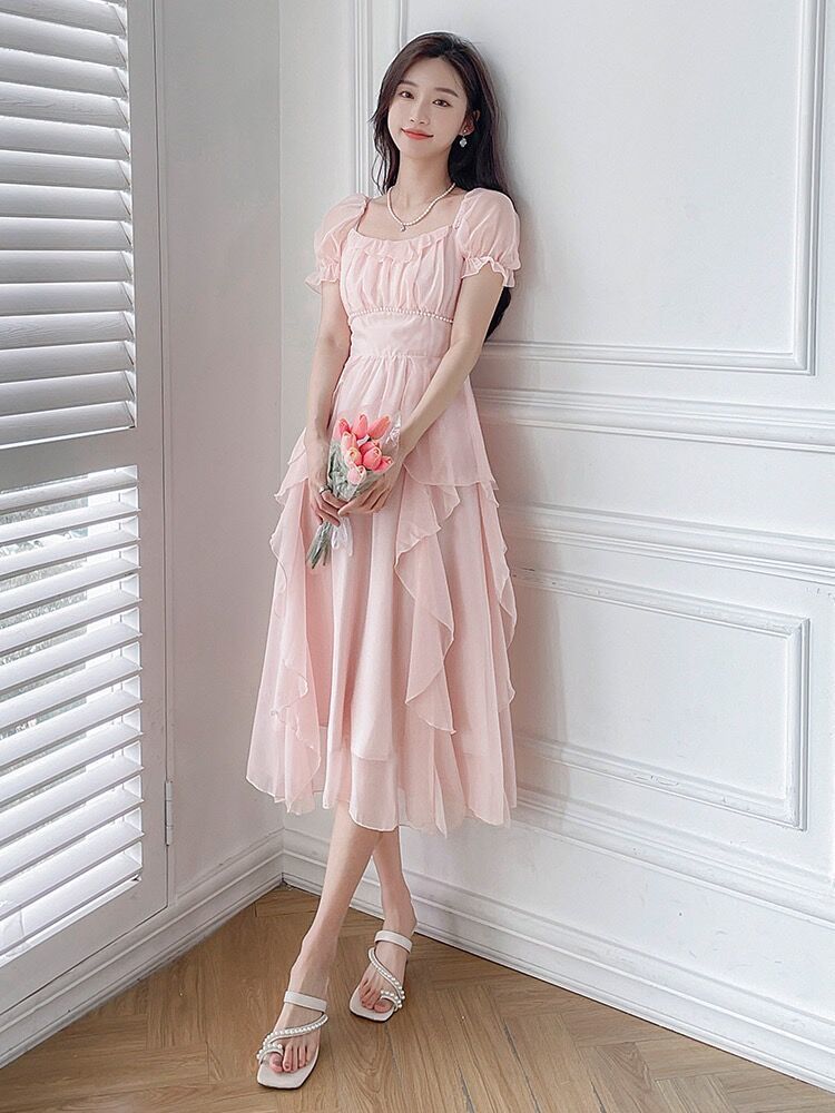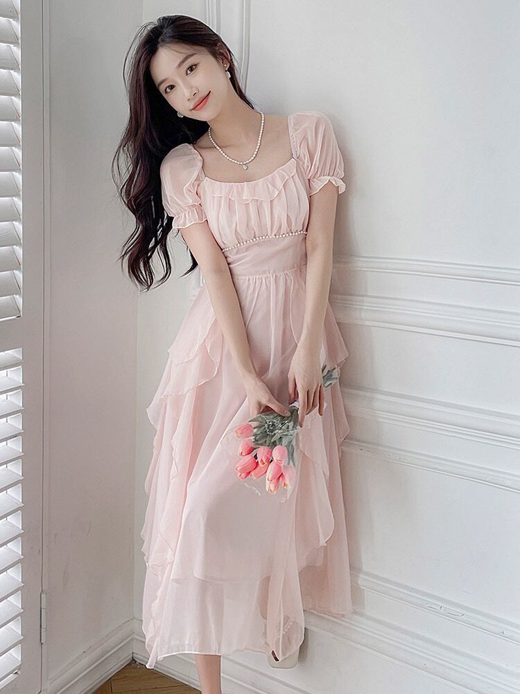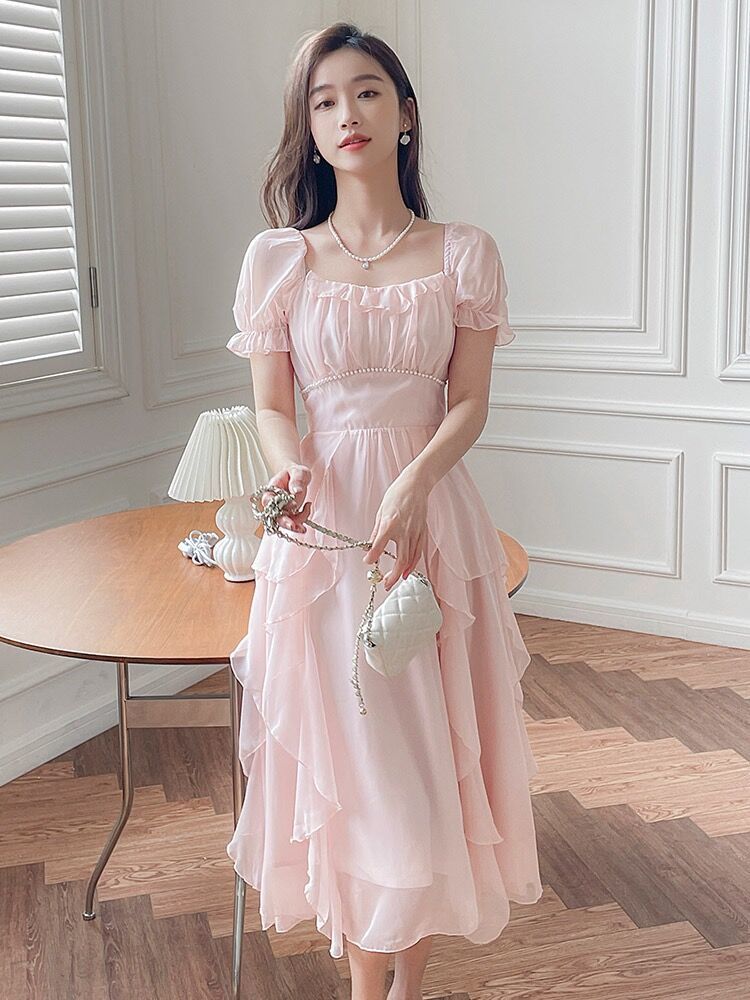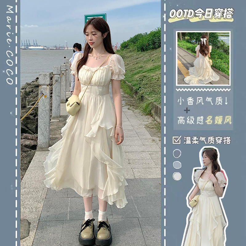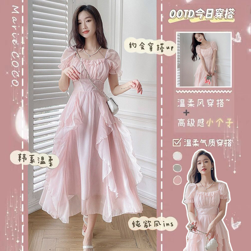 뉴 원피스 여성 2025 년 여름 프랑스 광장 칼라 달콤하고 부드러운 첫사랑 스타일 중간 길이의 시폰 스커트 여름스토어 가기