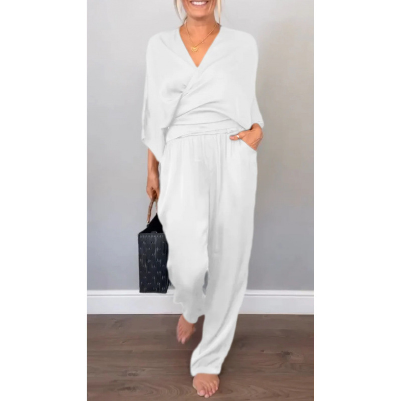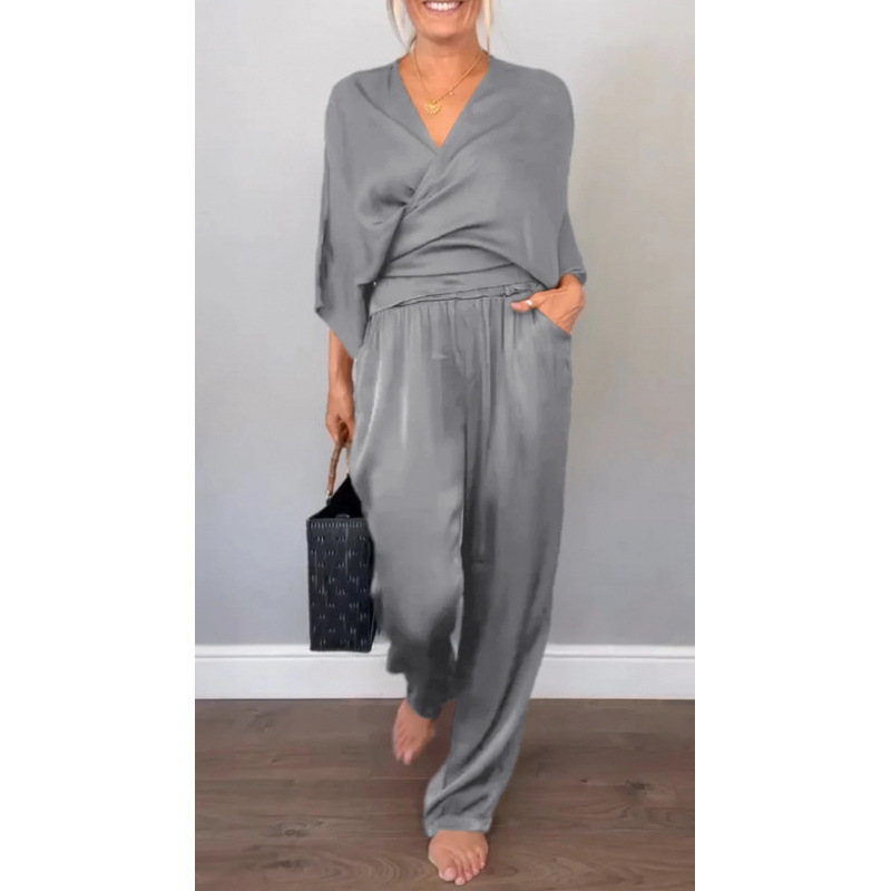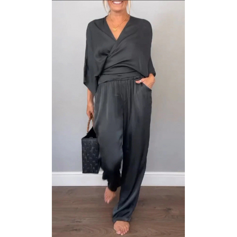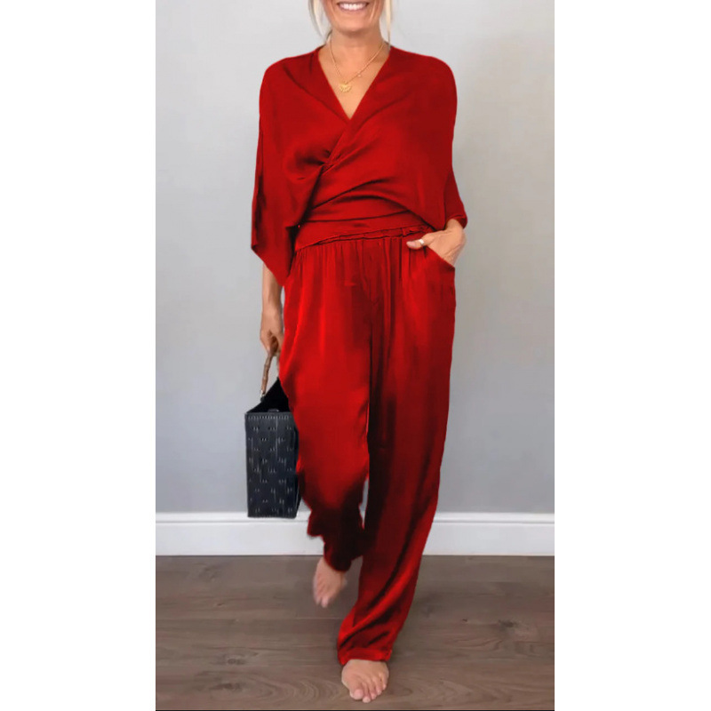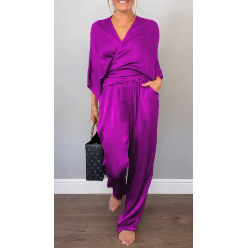 2025 아마존 독립 역 유럽과 미국의 국경 여성 여름 패션 단색 새틴 짧은 소매 최고 바지 세트
