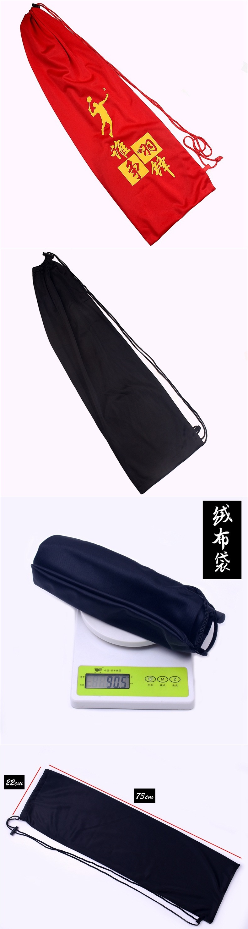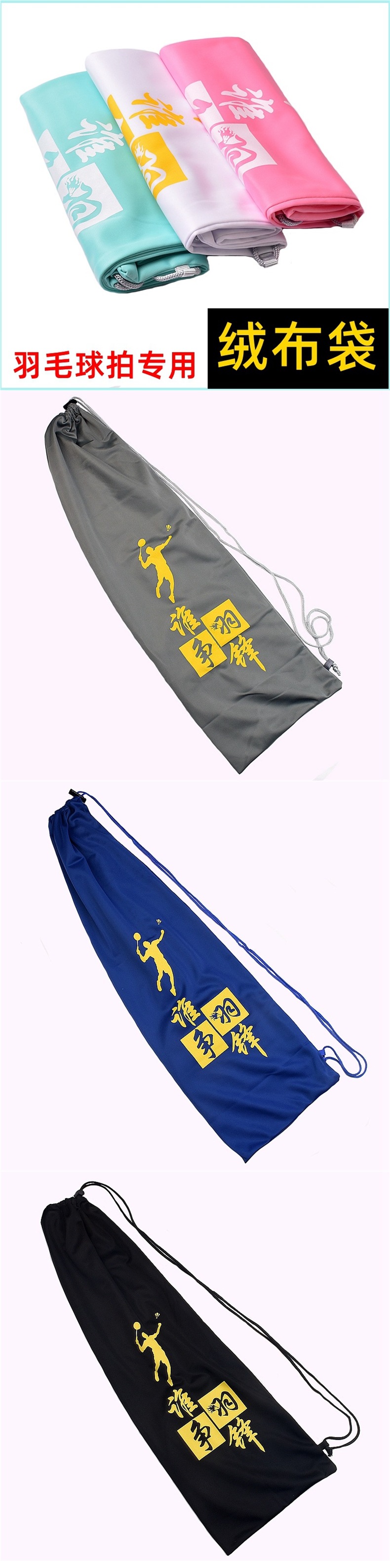 产品说明:羽毛球拍袋,通用羽毛球拍都是用绒布袋装,环保又节约空间,即易于携带,又利于放在大包中。