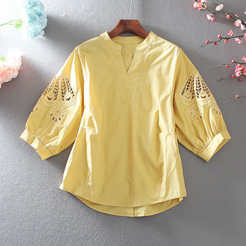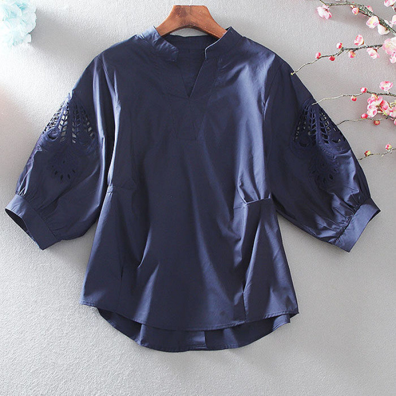 코튼 여름 칼라 우아한 미드 슬리브 할로우 아웃 디자인 센스 플러스 사이즈 느슨한 캐주얼 슬림 룩 올 매치 셔츠 여성용 탑