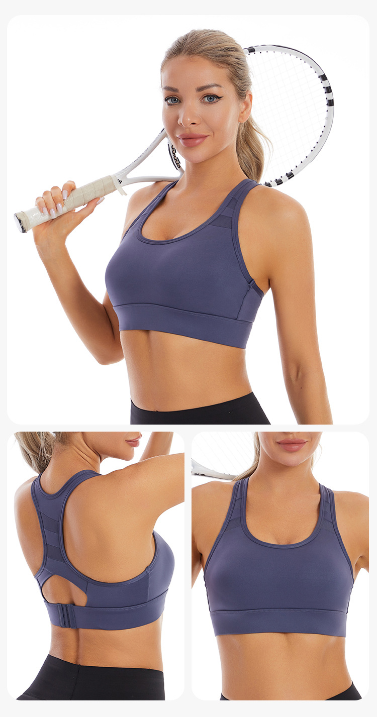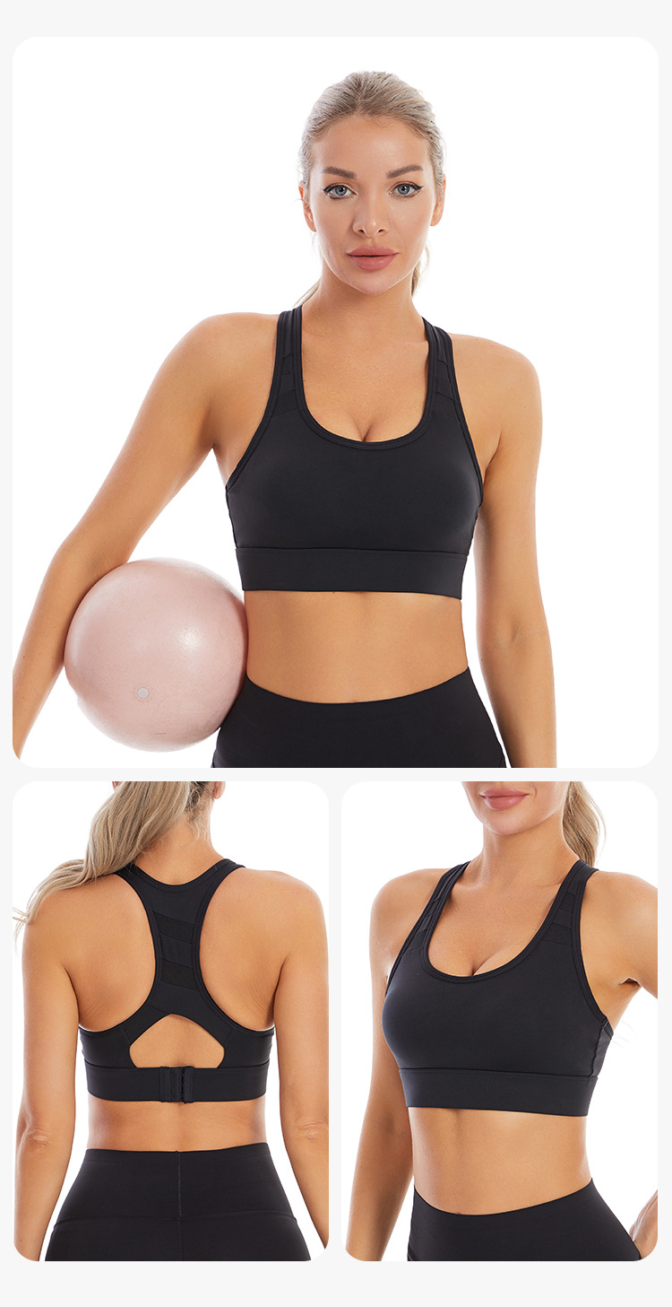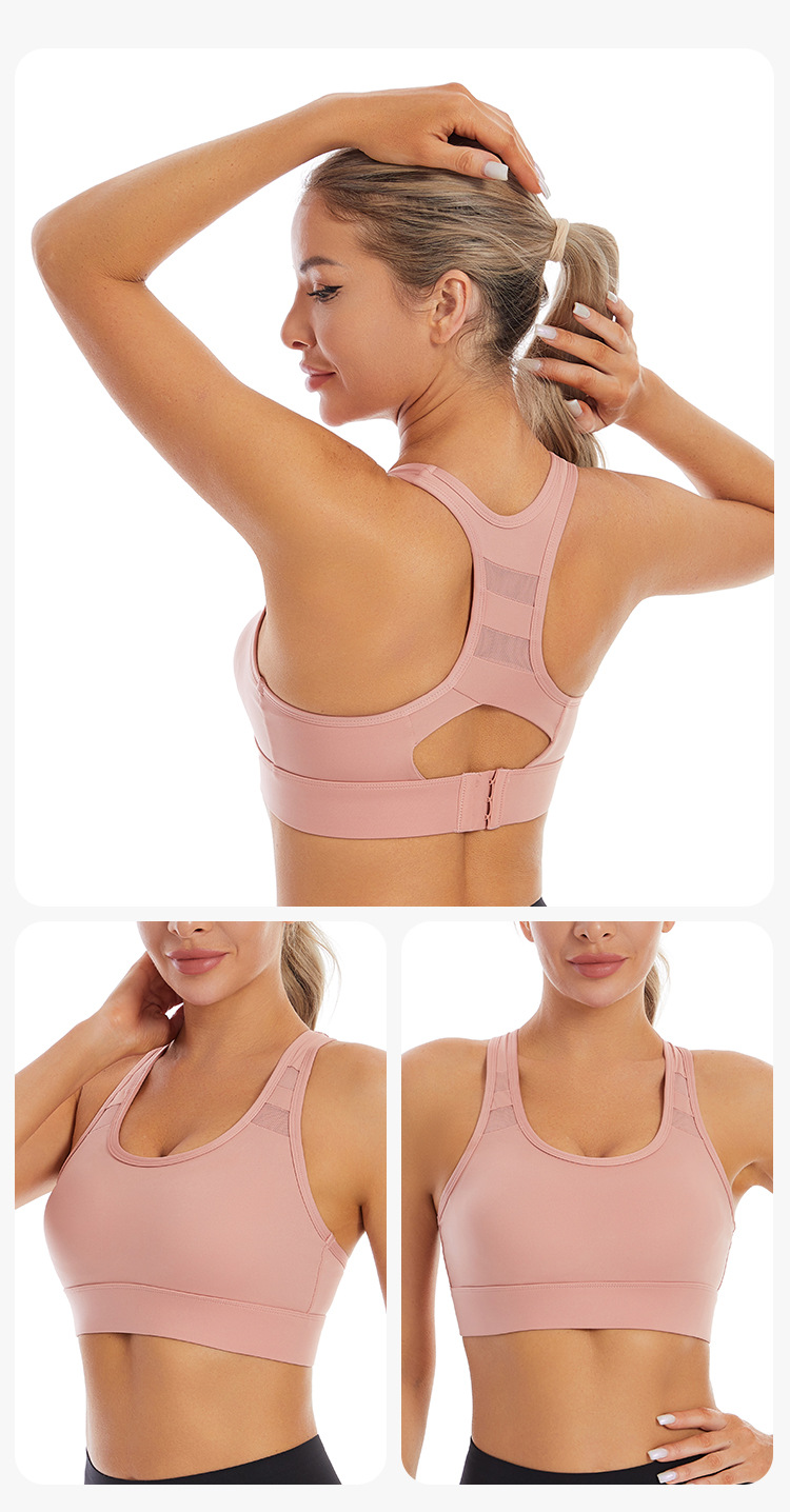 【特色】本款运动内衣采用固定式一体杯,稳固有形随心洗不跑杯,后背网纱拼接工字背设计修饰性感蝴蝶骨,美背舒适,三排扣可调节方便穿脱提升防震效果,U型领口聚拢无勒感,精选速干排汗透气的高弹锦纶运动面料,宽边下摆更好提升弹力性能。