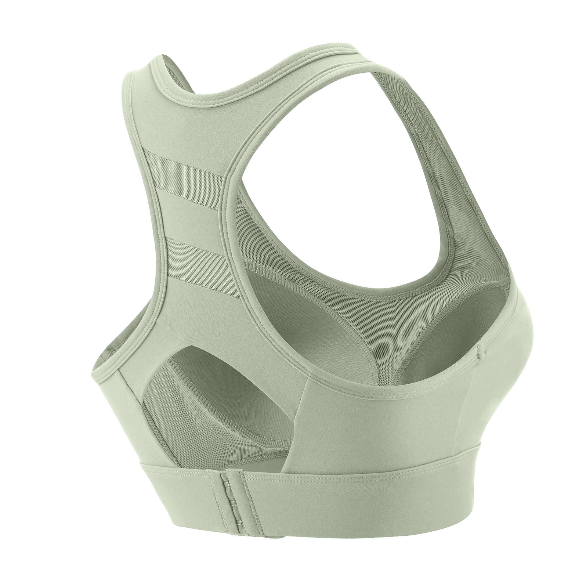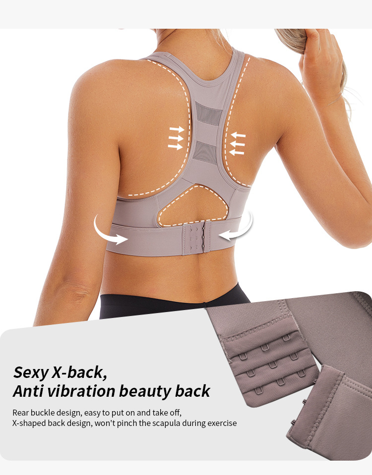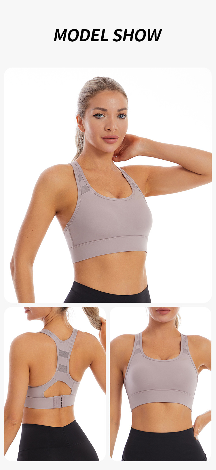 【特色】本款运动内衣采用固定式一体杯,稳固有形随心洗不跑杯,后背网纱拼接工字背设计修饰性感蝴蝶骨,美背舒适,三排扣可调节方便穿脱提升防震效果,U型领口聚拢无勒感,精选速干排汗透气的高弹锦纶运动面料,宽边下摆更好提升弹力性能。