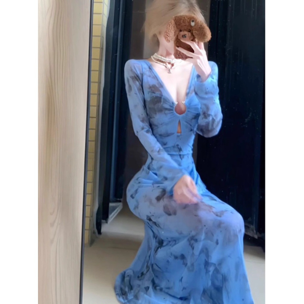 블루 프린트 긴팔 연예인 섹시한 원피스 캐주얼 디자인 봄 우아한 V 넥 피쉬 테일 긴 원피스스토어 가기