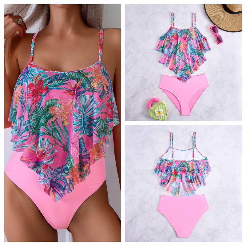여성용 프린트 하이웨이스트 탱키니 수영복, 오프 숄더 러플 스플릿 비키니 스포츠 스타일