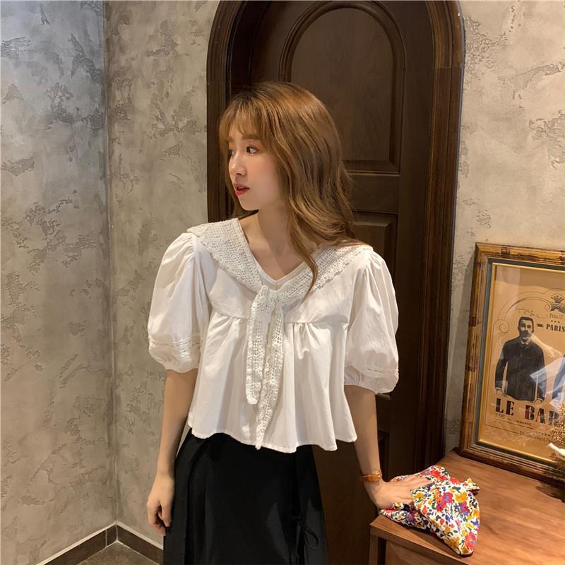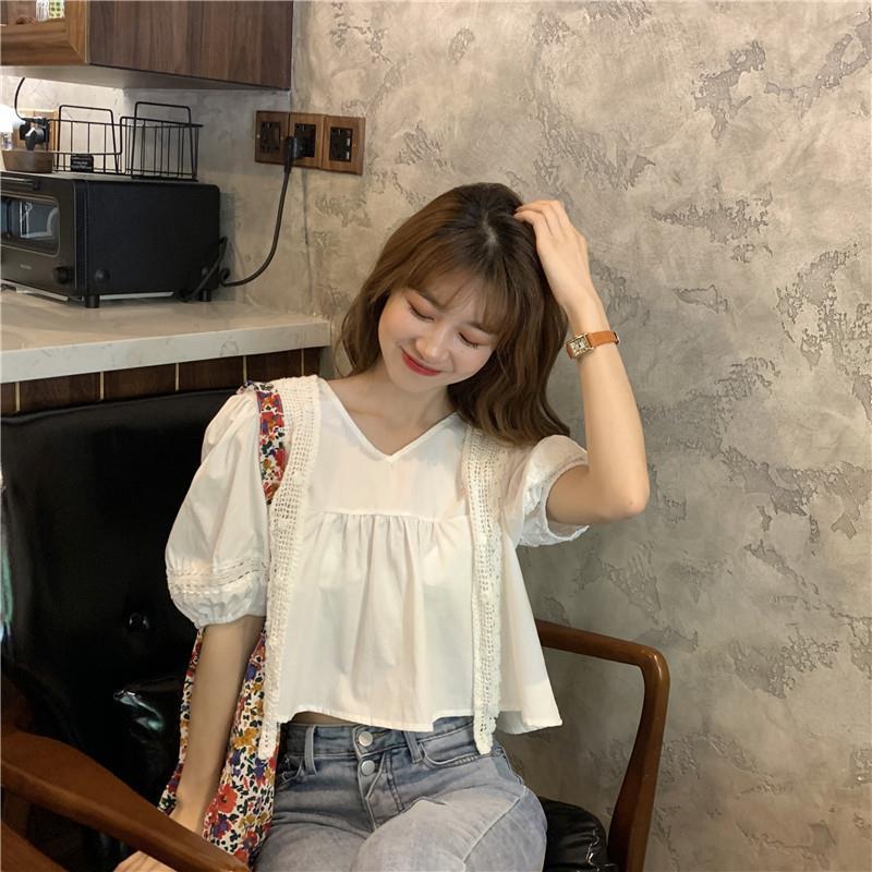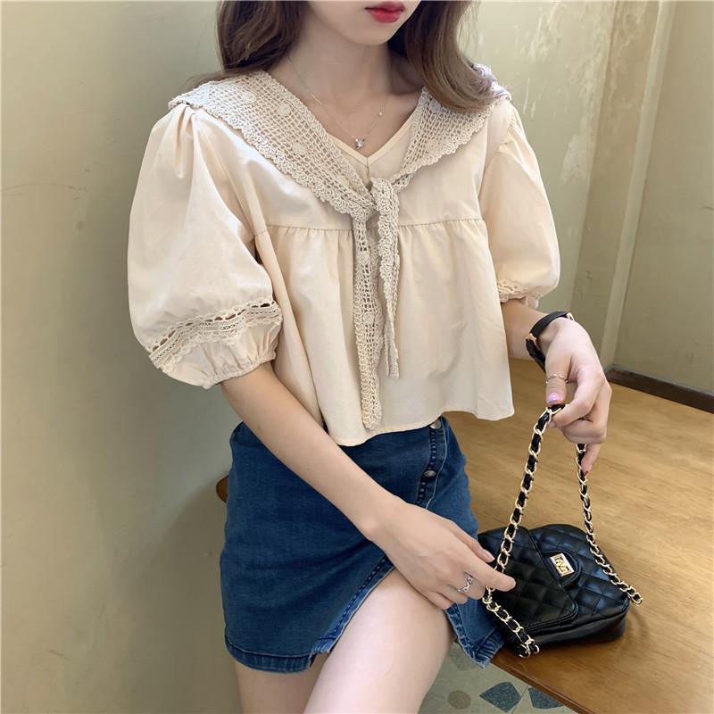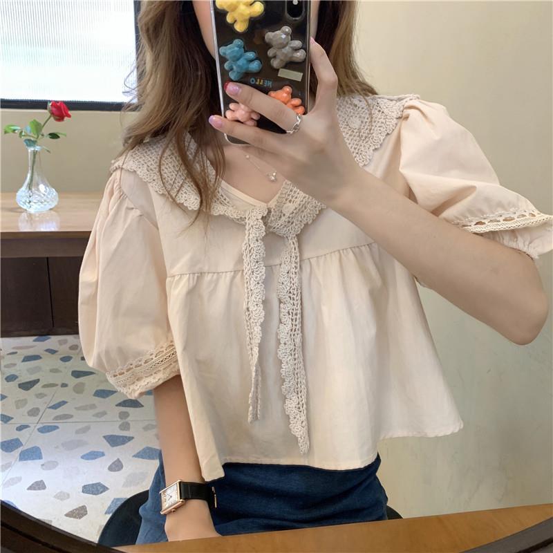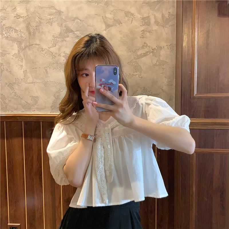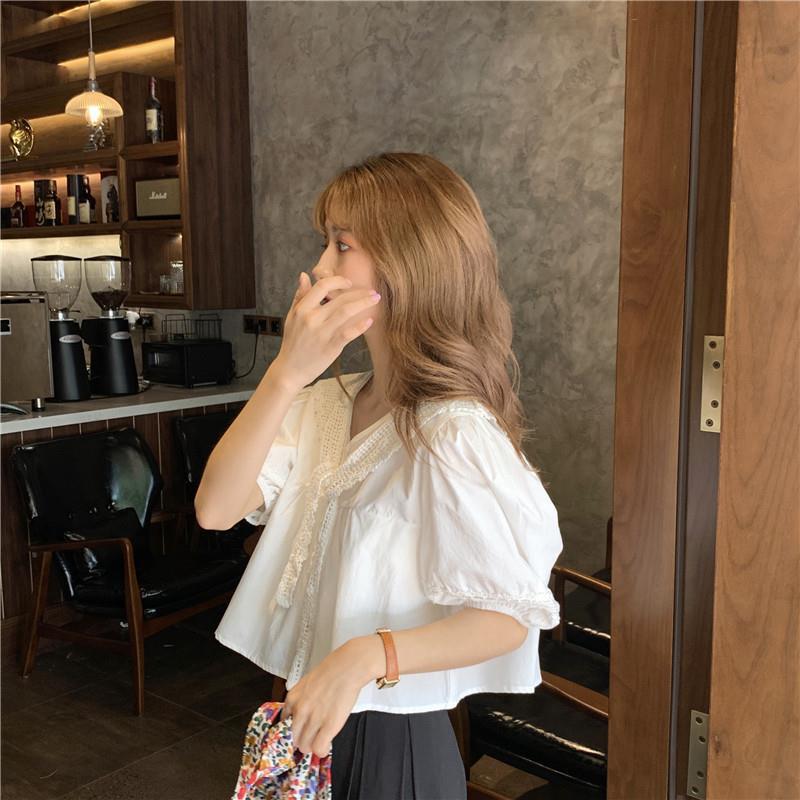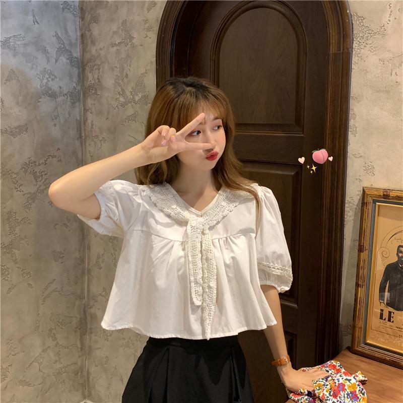 여름 2025 새로운 한국 스타일 숄 퍼프 소매 짧은 최고 디자인 틈새 슈퍼 요정 짧은 소매 셔츠 여성 의류스토어 가기