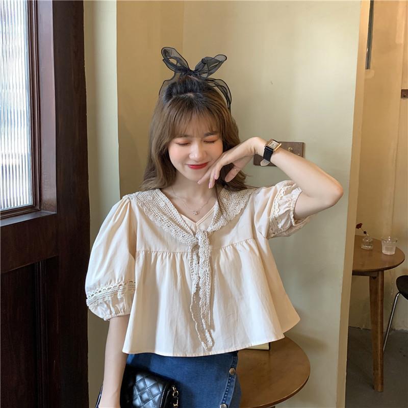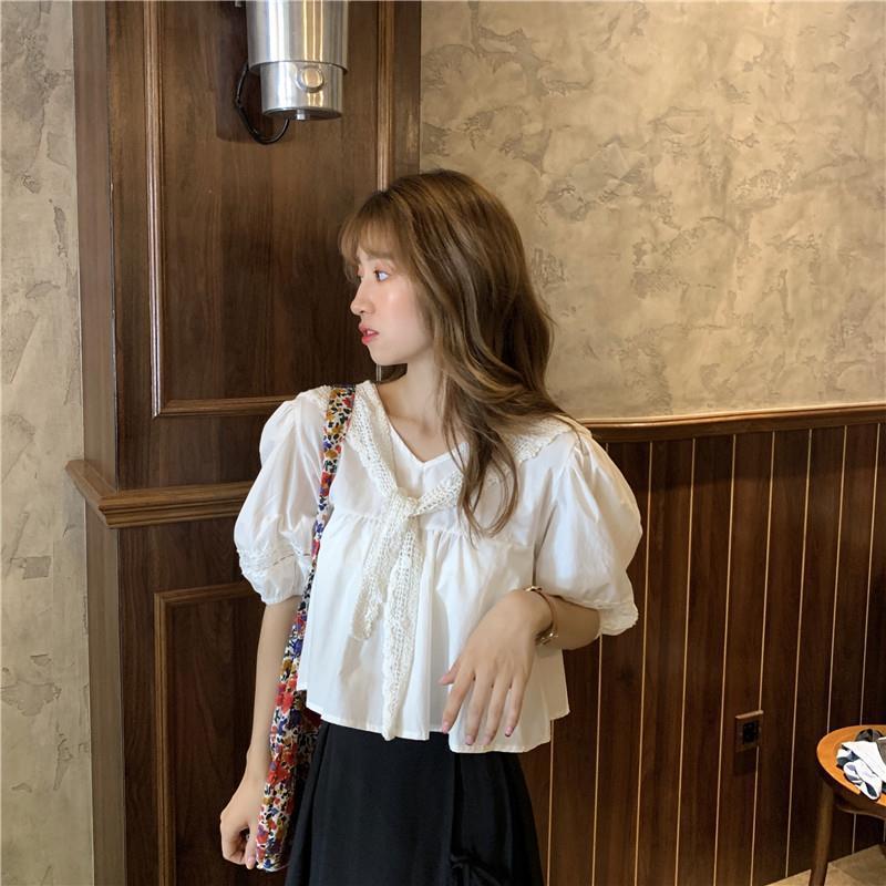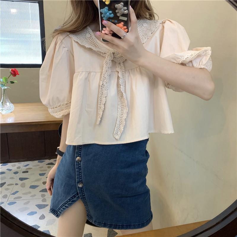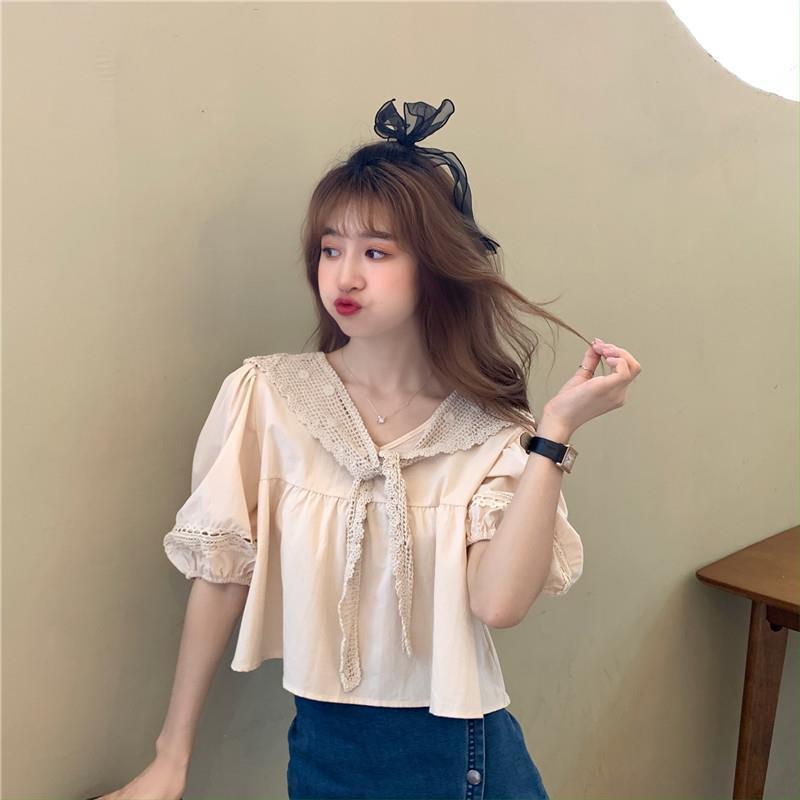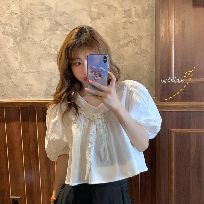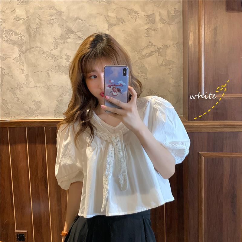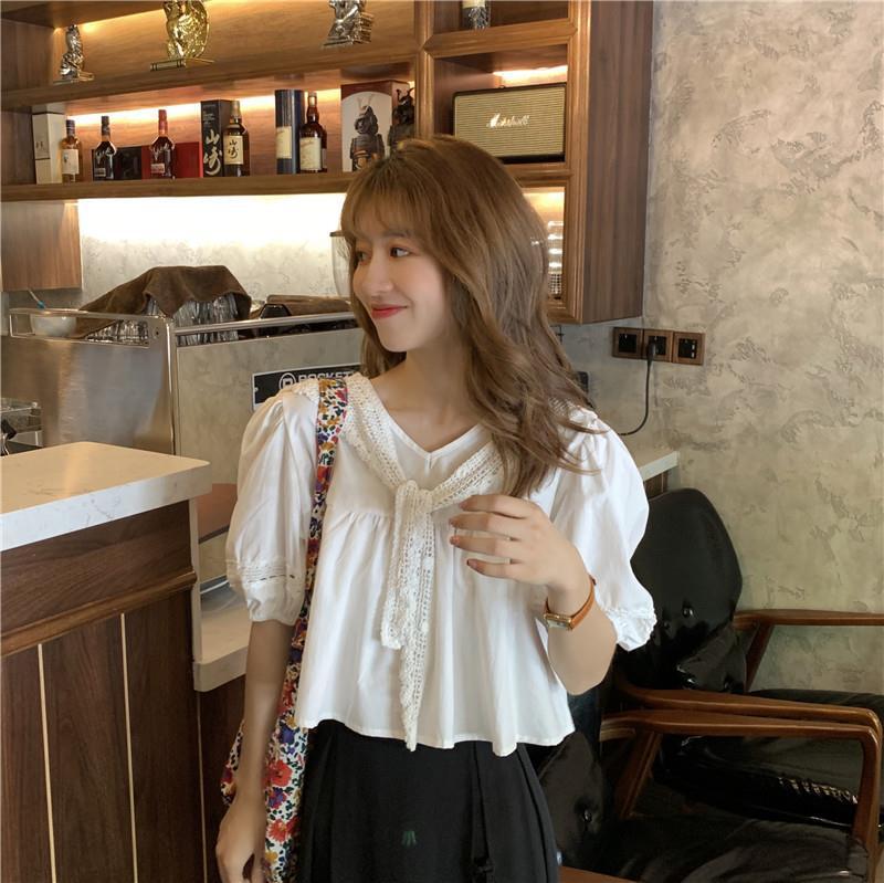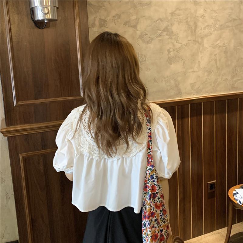 여름 2025 새로운 한국 스타일 숄 퍼프 소매 짧은 최고 디자인 틈새 슈퍼 요정 짧은 소매 셔츠 여성 의류스토어 가기