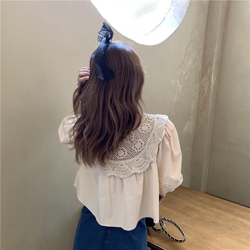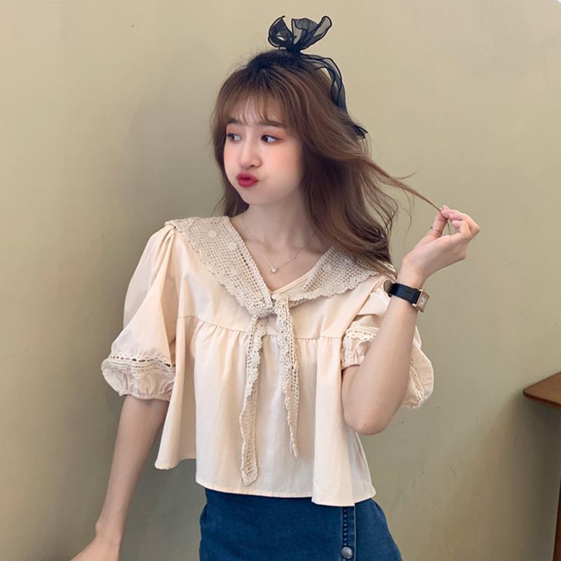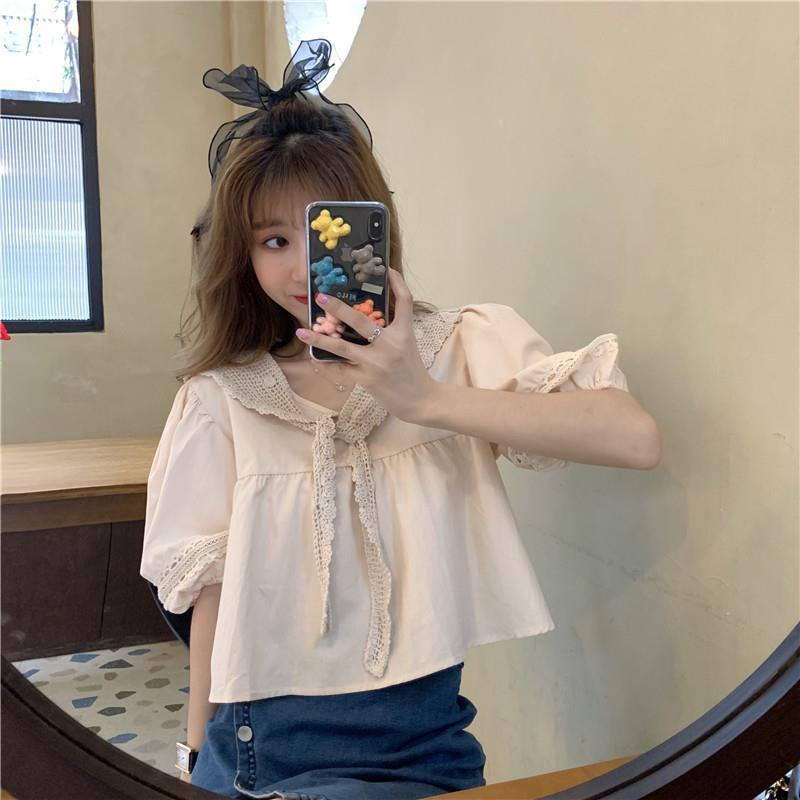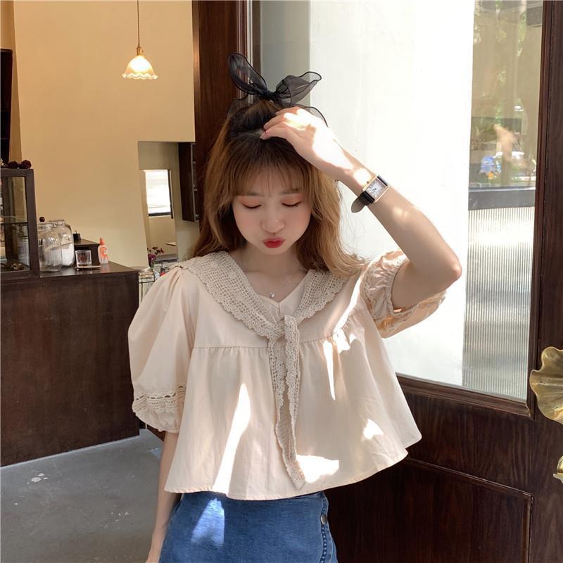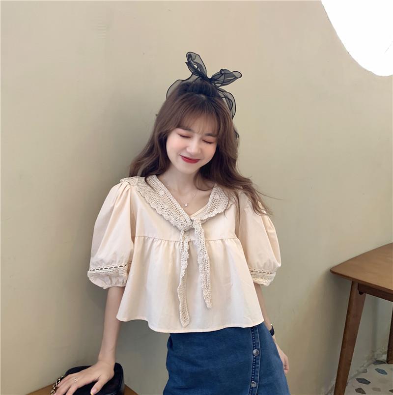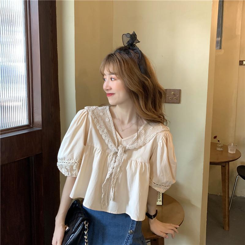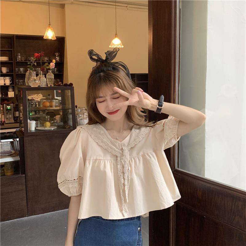 여름 2025 새로운 한국 스타일 숄 퍼프 소매 짧은 최고 디자인 틈새 슈퍼 요정 짧은 소매 셔츠 여성 의류스토어 가기