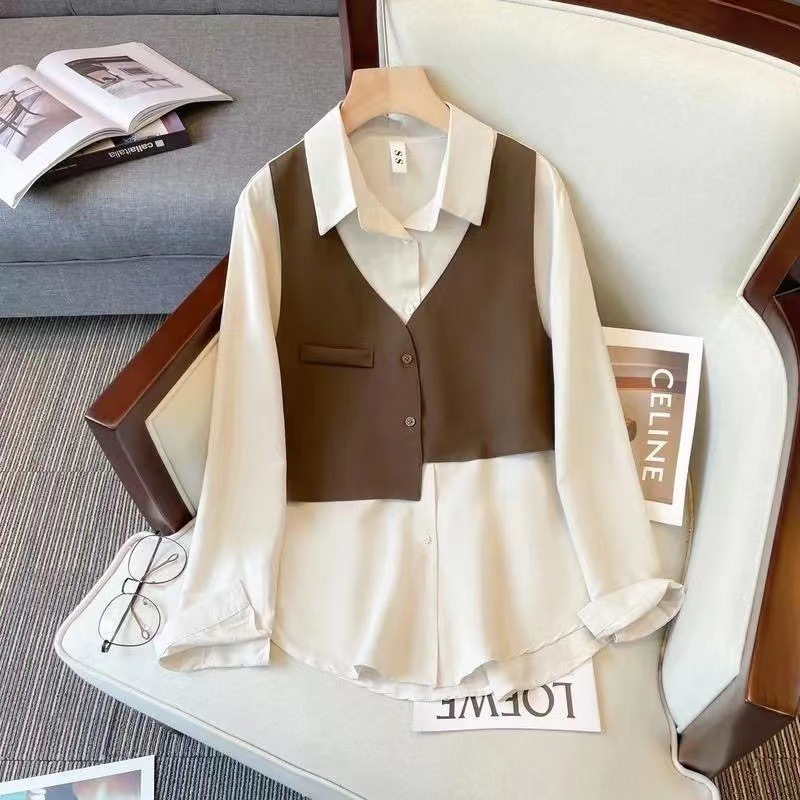 가짜 투피스 셔츠 여성 디자인 센스 스티칭 세트 조끼 2025 가을 뉴 지방 느슨한 슬리밍 긴팔 셔츠스토어 가기