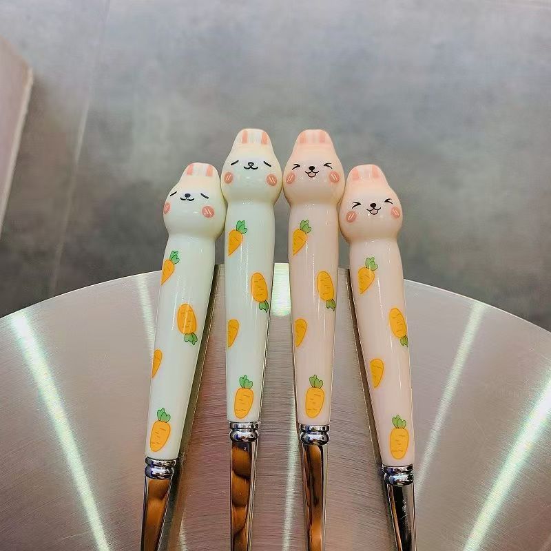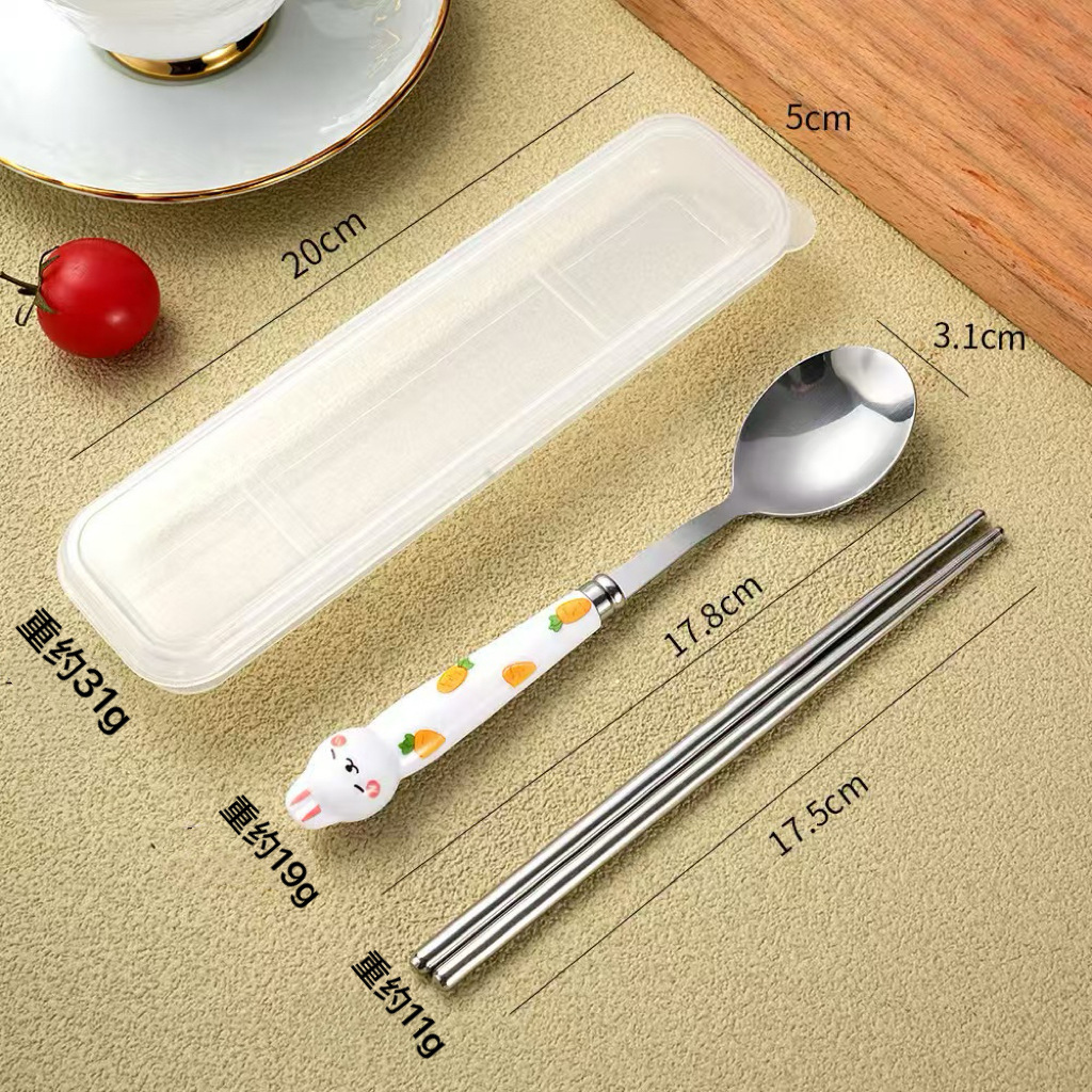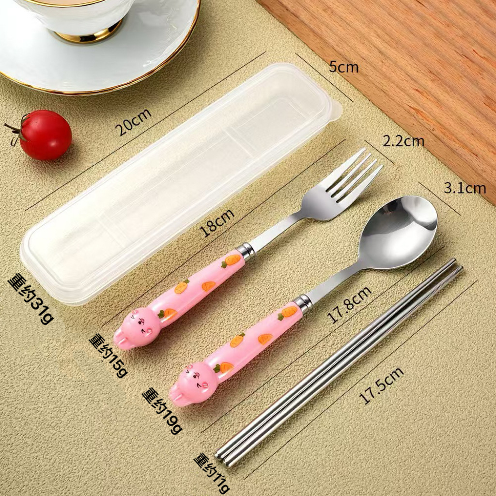 만화 무 토끼 휴대용 식기 스테인레스 스틸 젓가락 숟가락 포크 3 피스 세트 학생 야외 여행 휴대용 식기 세트스토어 가기