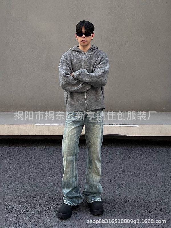 春秋季新款水洗蓝个性百搭做旧牛仔裤男女微喇直筒复古阔腿长裤