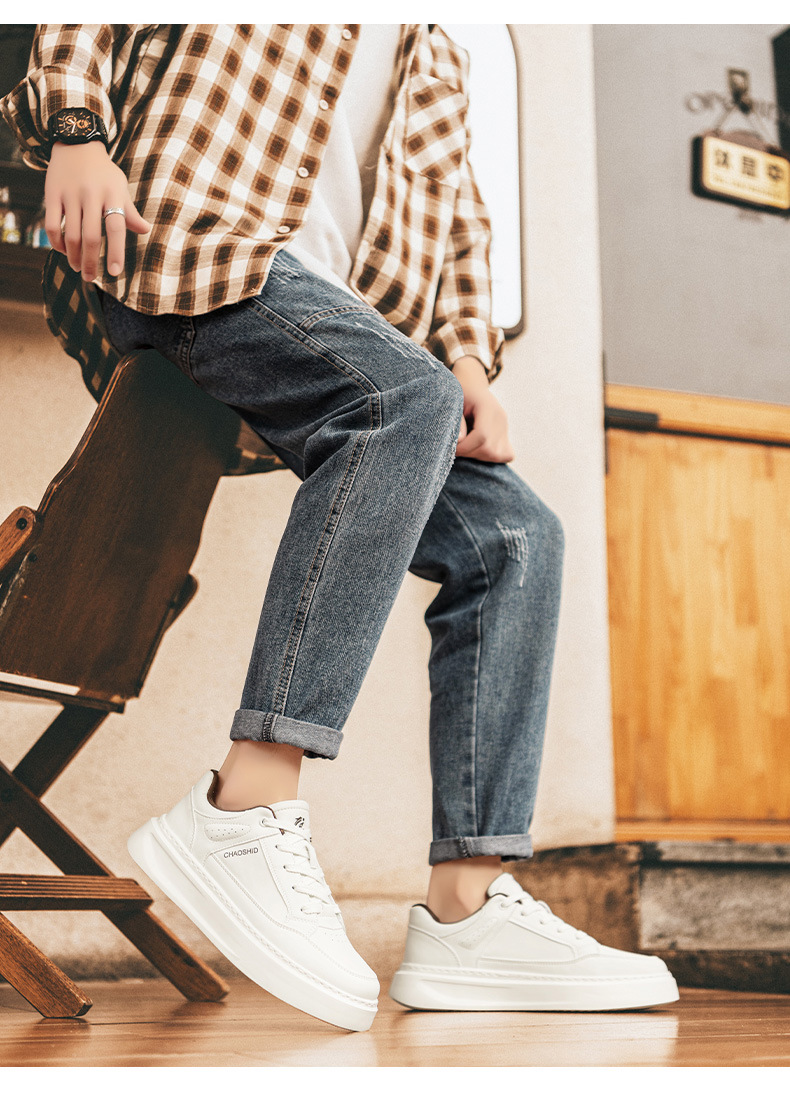 남성용 신발 2025 새로운 봄 유행 고급 솔리드 컬러 스니커즈 남성용 가죽 탑 두꺼운 밑창 스포츠 레저 트렌드