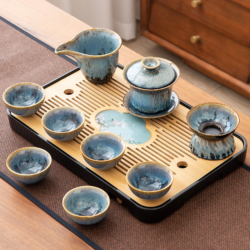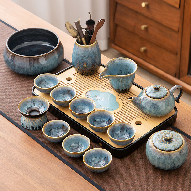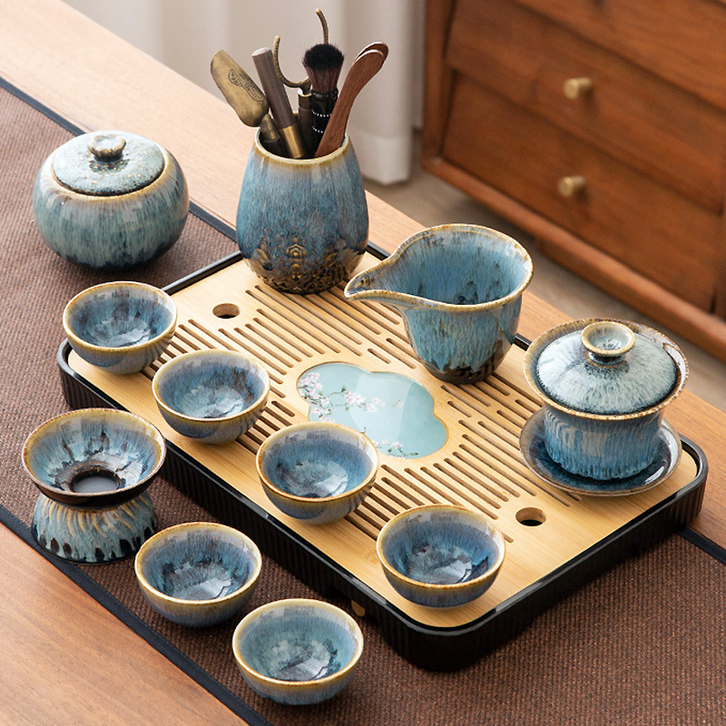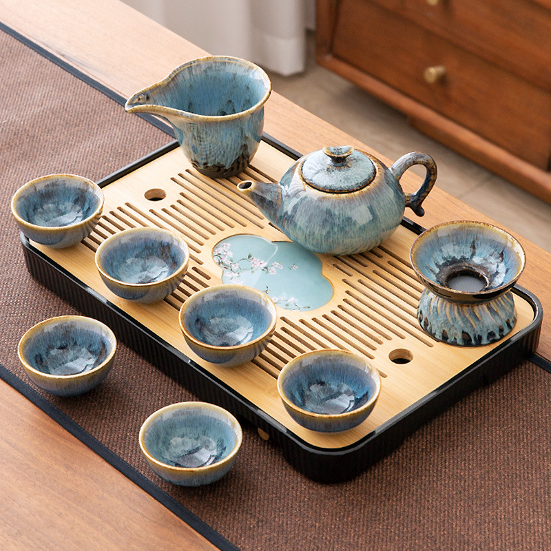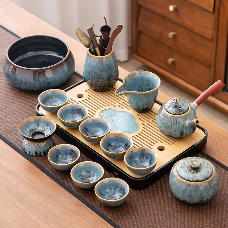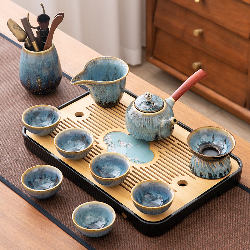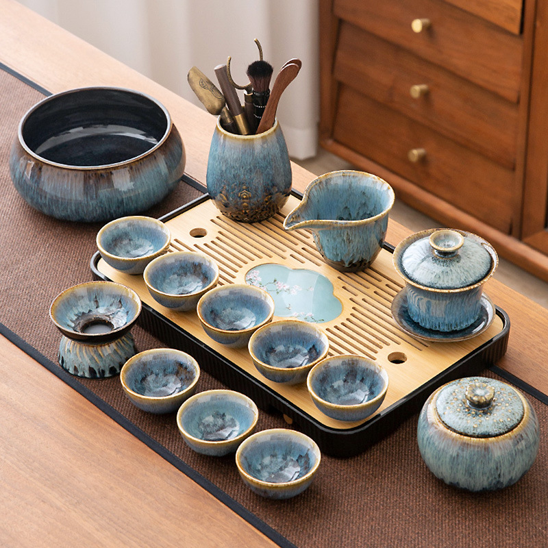 가마 변화 쿵푸 차 세트 세트 가구 빛 럭셔리 세라믹 주전자 커버 그릇 티 컵 작은 차 트레이 오피스 완전한 세트