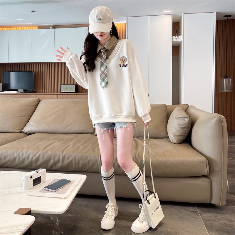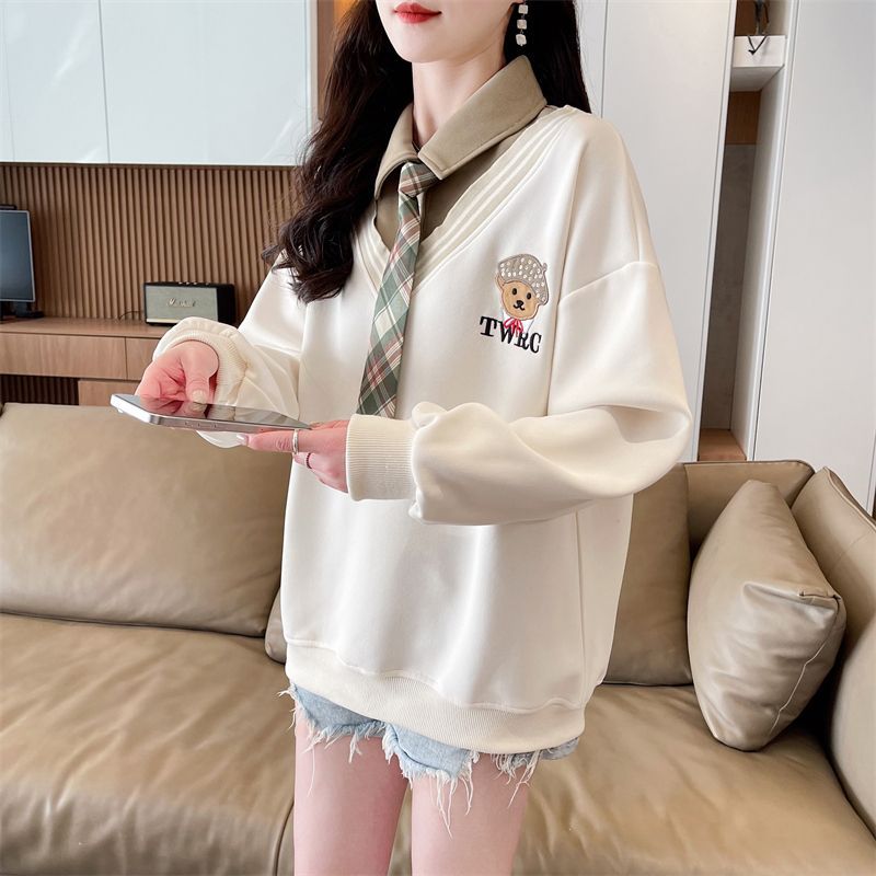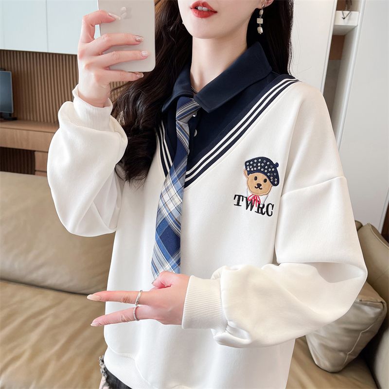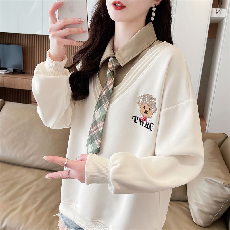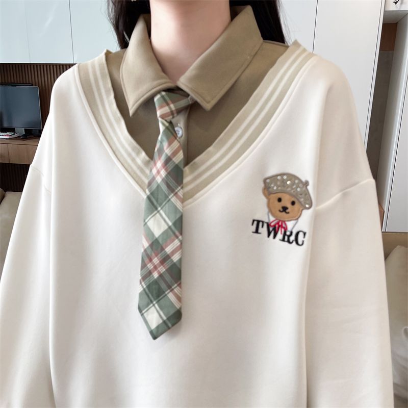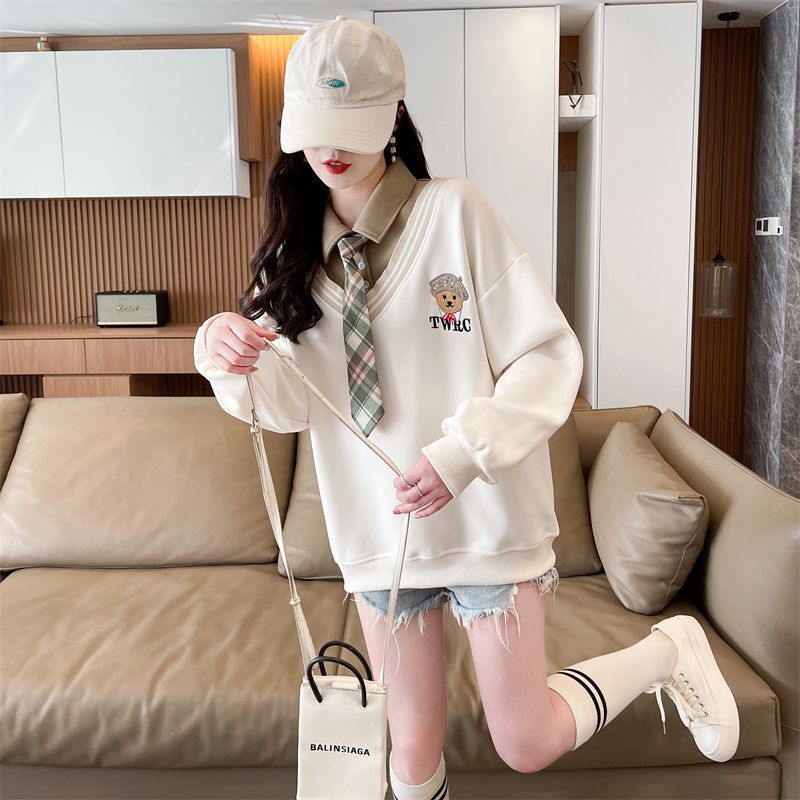 가짜 투피스 스티치 스웨트 여성 봄과 가을 자수 베어 하이 엔드 루즈 스타일 라지 스타일 옷깃 중학교 탑
