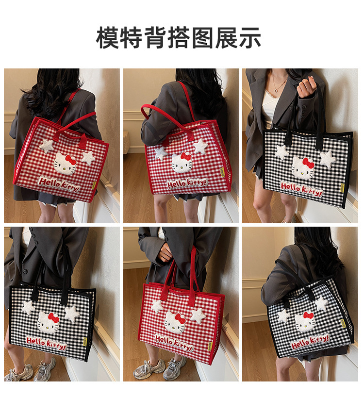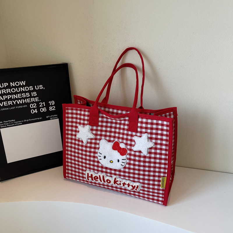 귀여운 고양이 자수 여성 어깨 가방 대용량 체크 무늬 캔버스 가방 학생 학교 가방 쇼핑 새로운 유행 천 가방스토어 가기