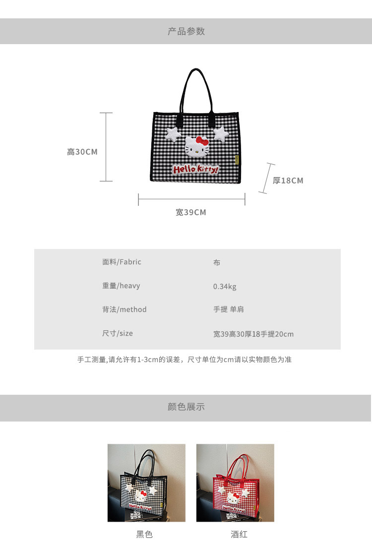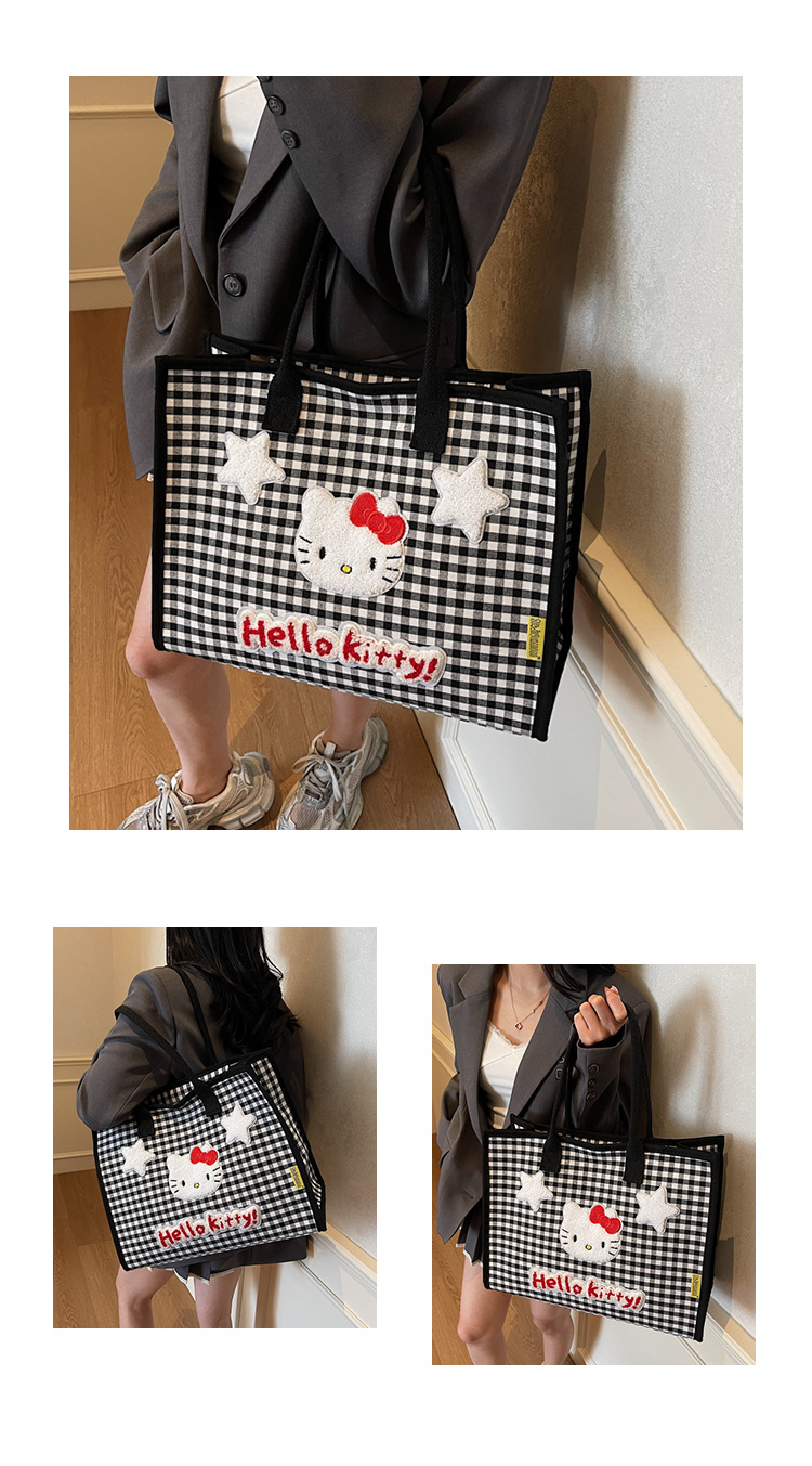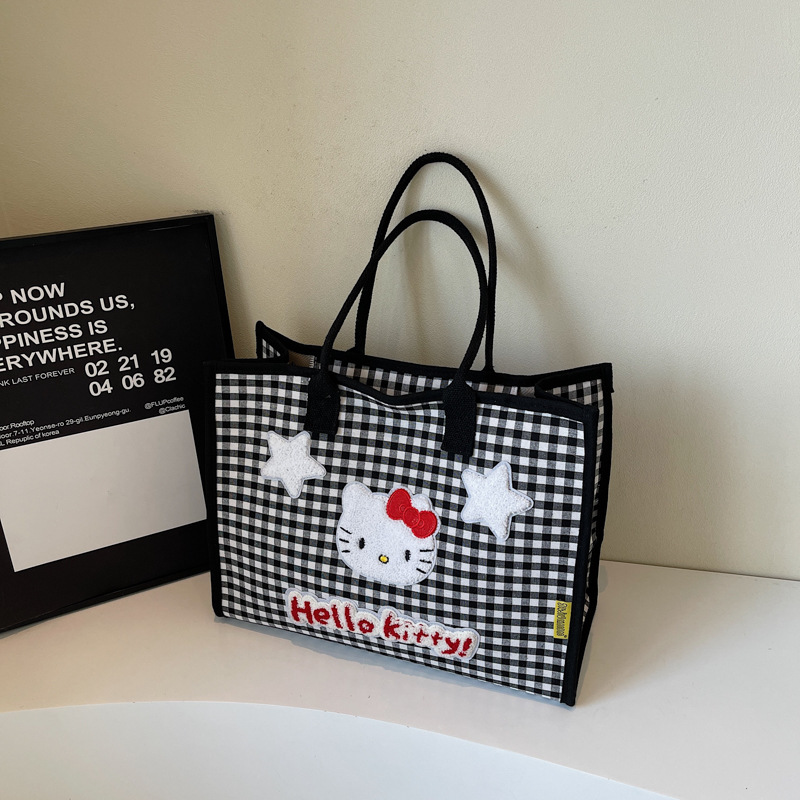 귀여운 고양이 자수 여성 어깨 가방 대용량 체크 무늬 캔버스 가방 학생 학교 가방 쇼핑 새로운 유행 천 가방