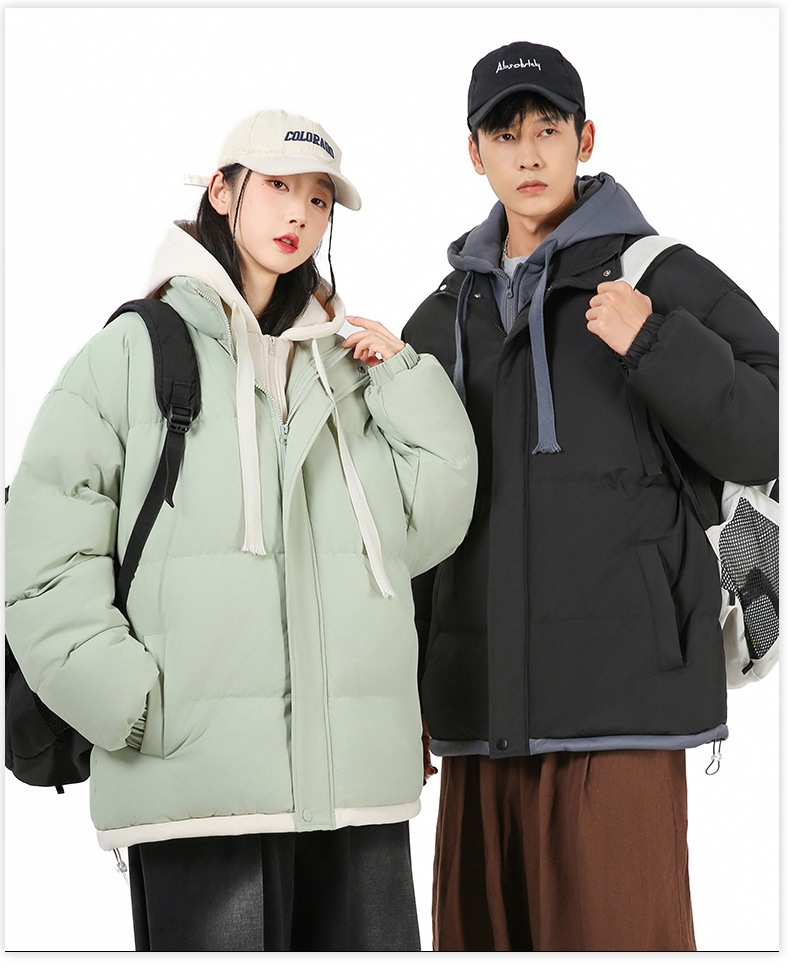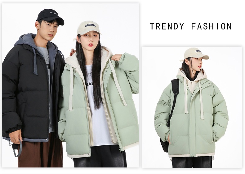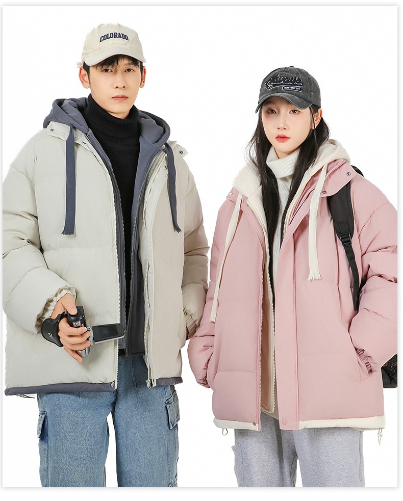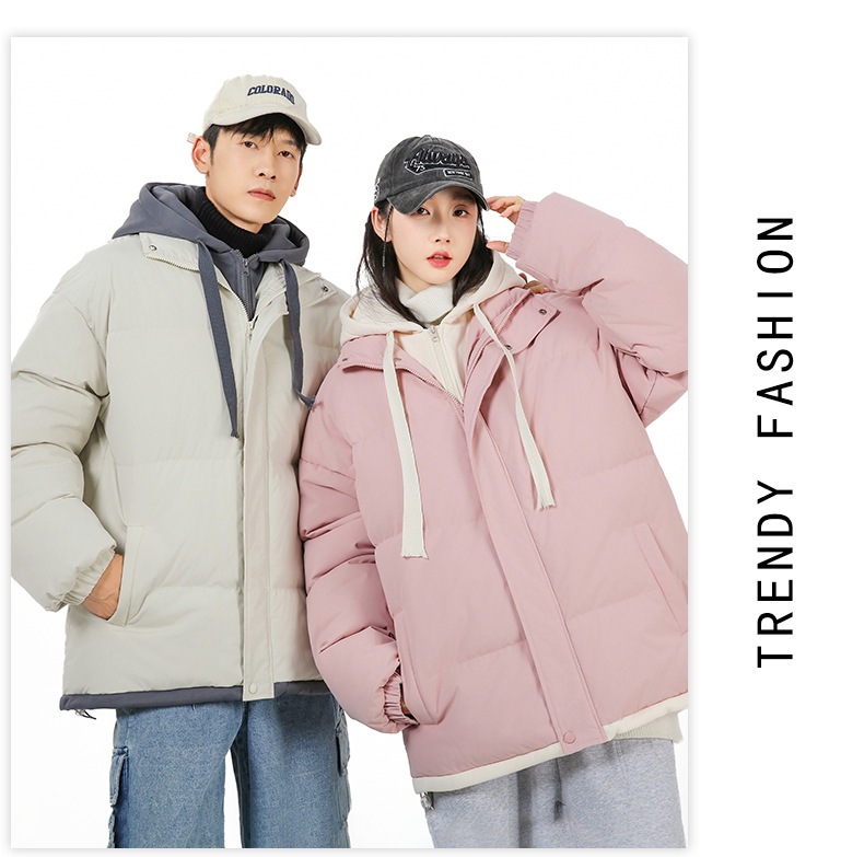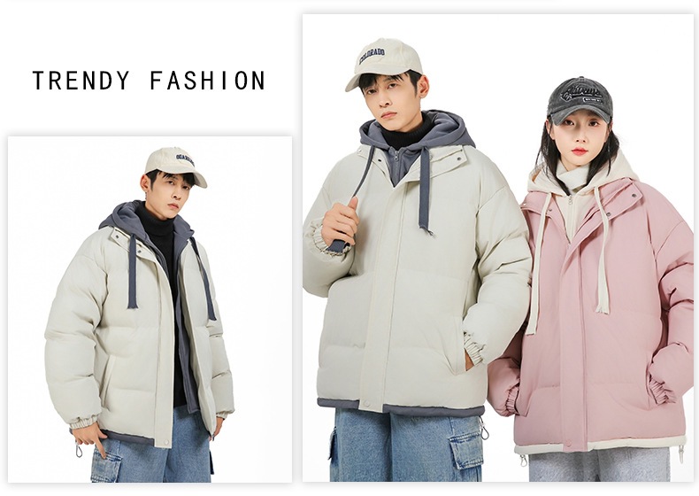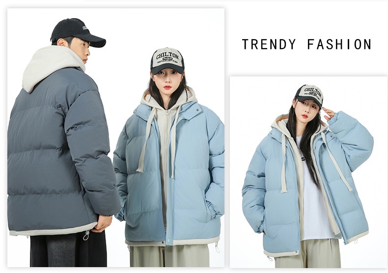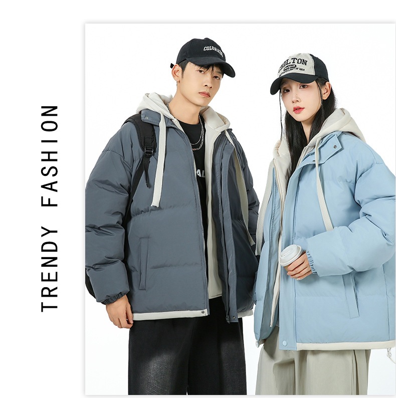두건면 패딩 재킷 남성과 여성 패션 커플 두꺼운 코트 겨울면 패딩 코트 커플 가짜 투피스 빵 의류 재고 도매