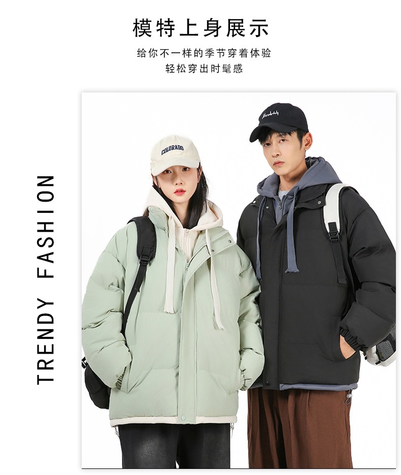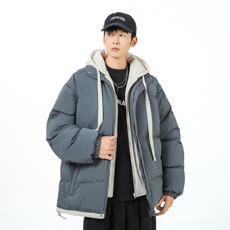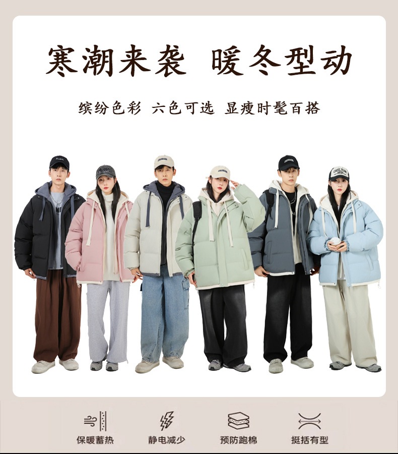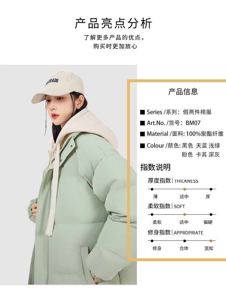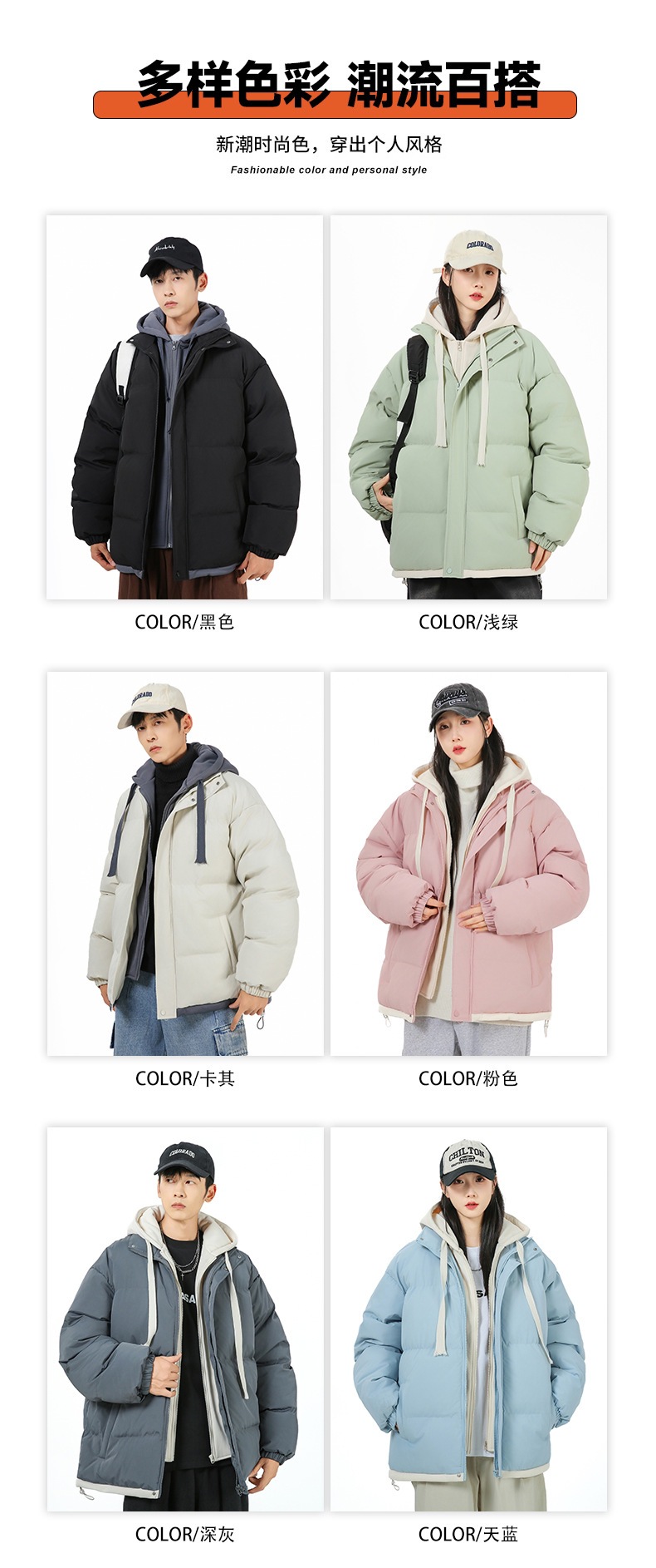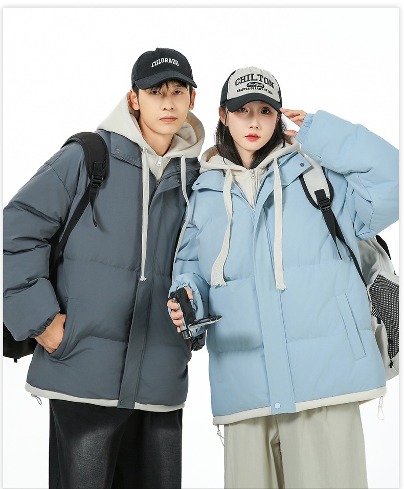 두건면 패딩 재킷 남성과 여성 패션 커플 두꺼운 코트 겨울면 패딩 코트 커플 가짜 투피스 빵 의류 재고 도매