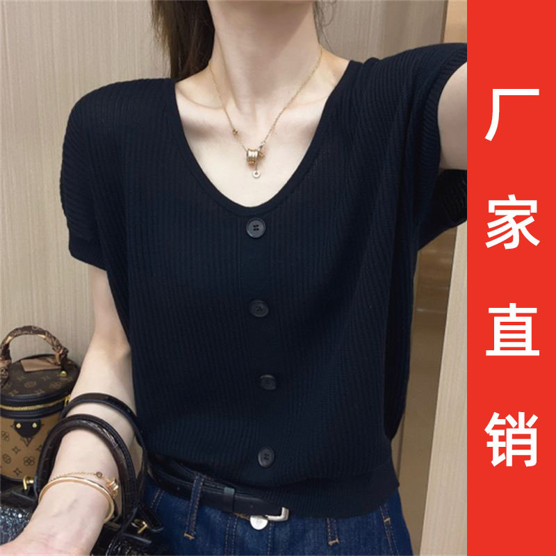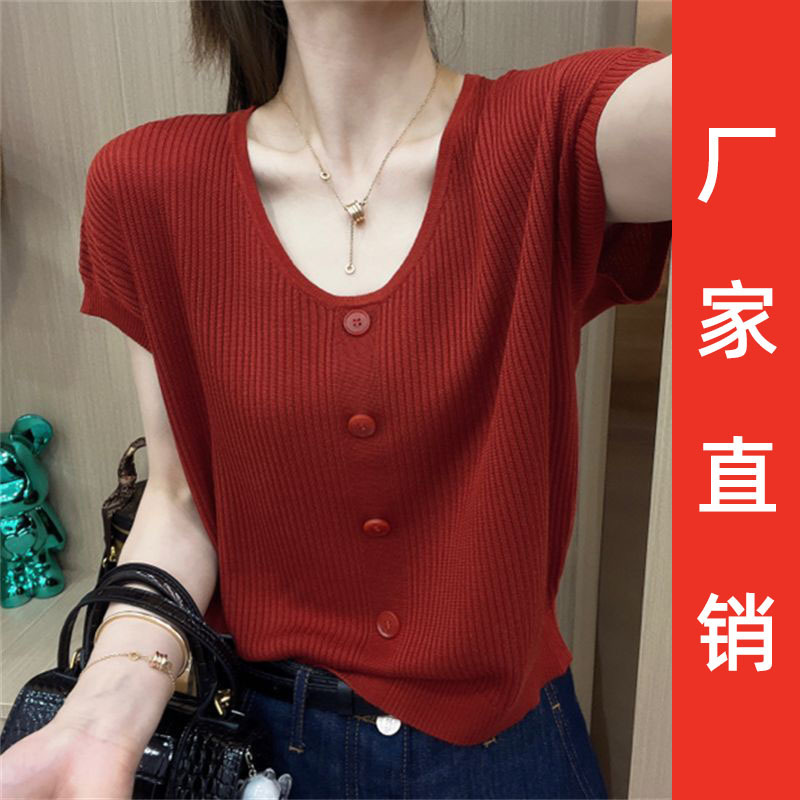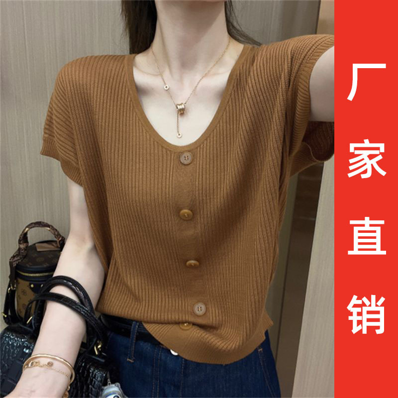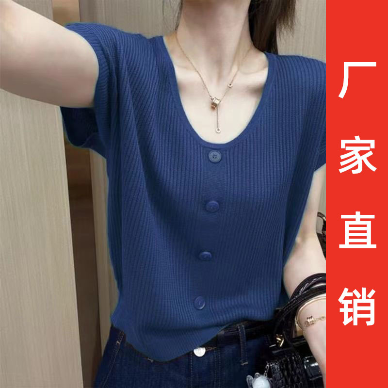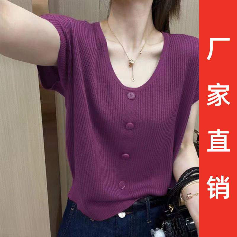 느슨한 슬림 유행 라운드 넥 아이스 실크 반팔 티셔츠 여성용 여름 뉴 에이지 감소 니트 티셔츠 플러스 사이즈 탑스토어 가기