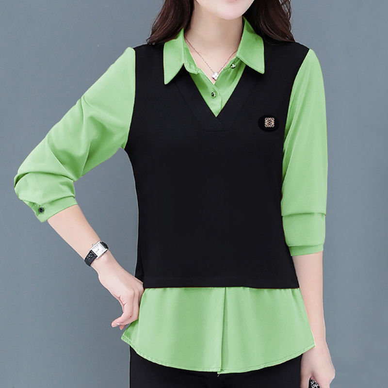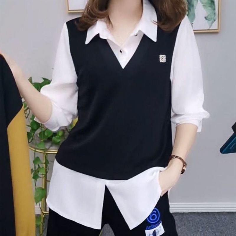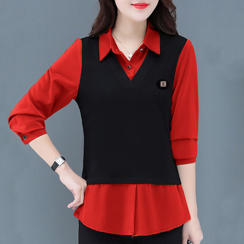 가짜 투피스 셔츠 여성용 경량 가을 새 스타일 탑 루즈 슬리밍 엄마의 플러스 사이즈 스타일러베이스 셔츠
