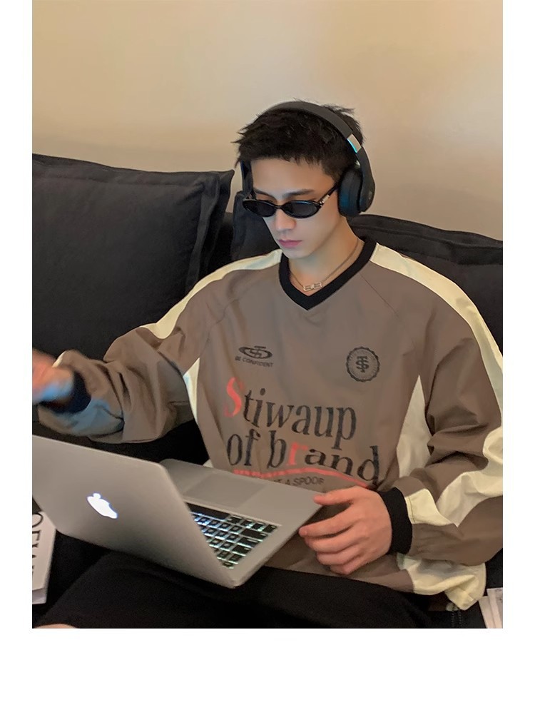 2025 봄과 가을 새로운 리얼 샷 미국 레트로 올 매치 트렌디 커플 컬러 매칭 스티칭 느슨한 긴 소매 땀스토어 가기