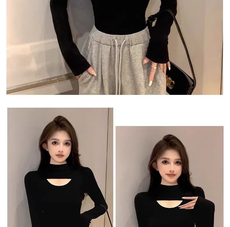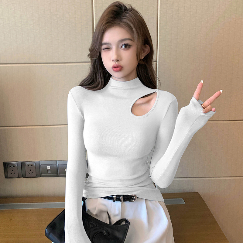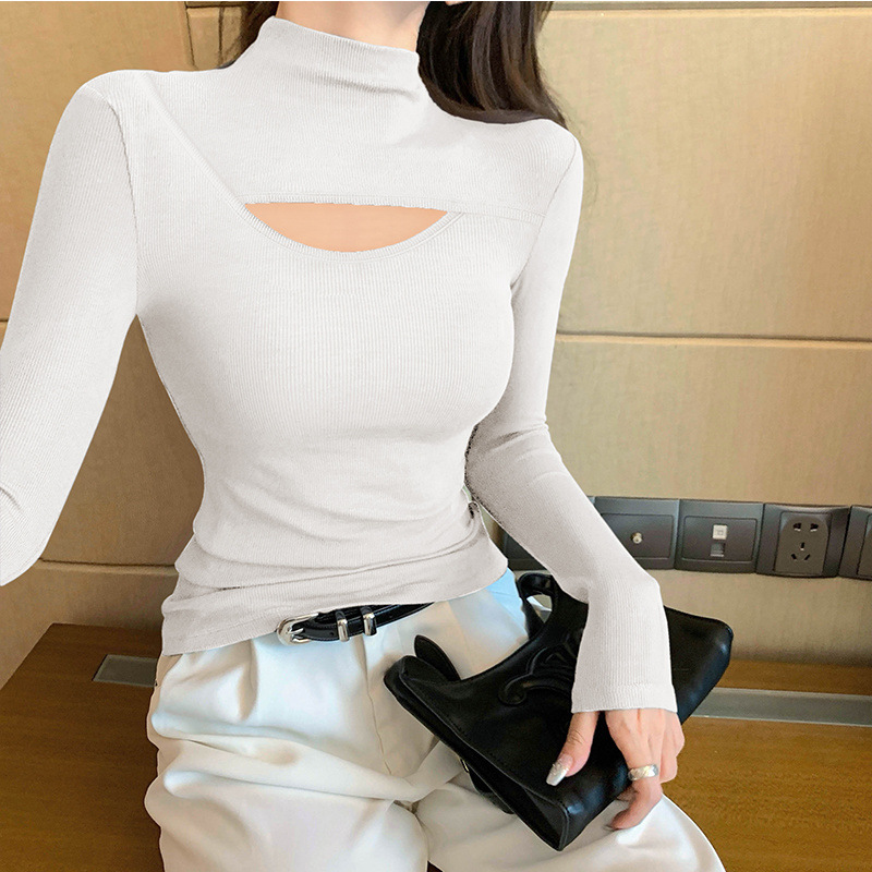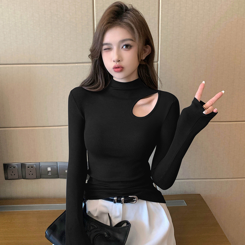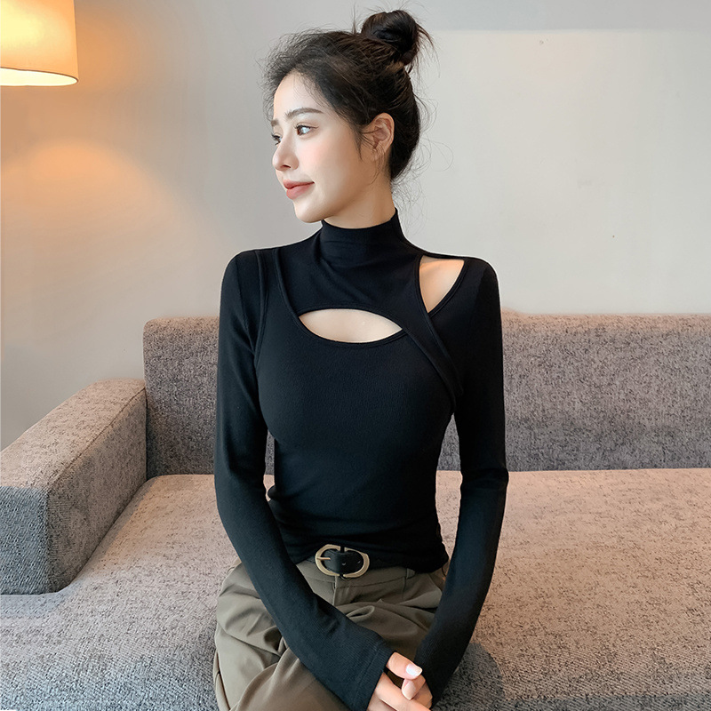 블랙 스레드 세미 하이 칼라 프론트 할로우 슬림 핏 긴팔 2024 새로운베이스 셔츠 여성의 가을과 겨울 로우 칼라 이너 탑스토어 가기