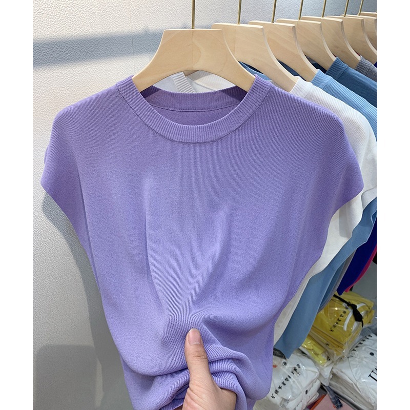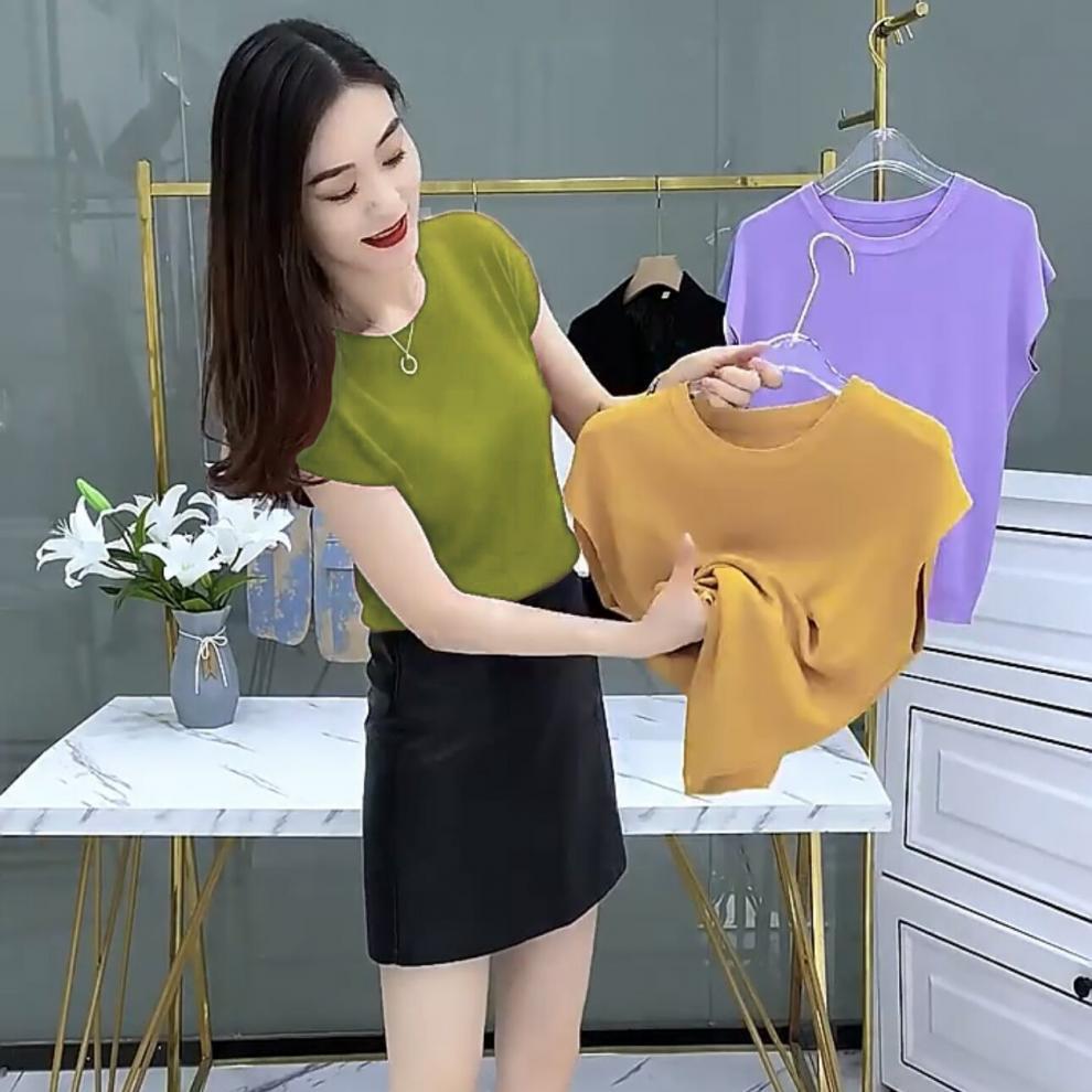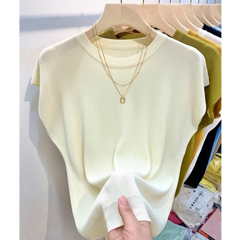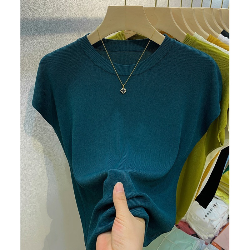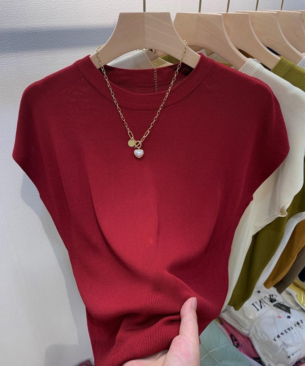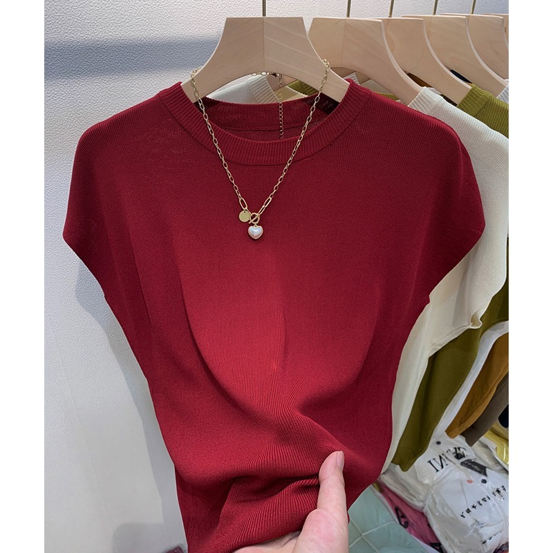 여름 얇은 아이스 실크 니트 셔츠 여성용 반소매 로얄 자매 스타일 티셔츠 슬림 핏 우아한 나이 감소 레드 반팔 셔츠 얇은스토어 가기