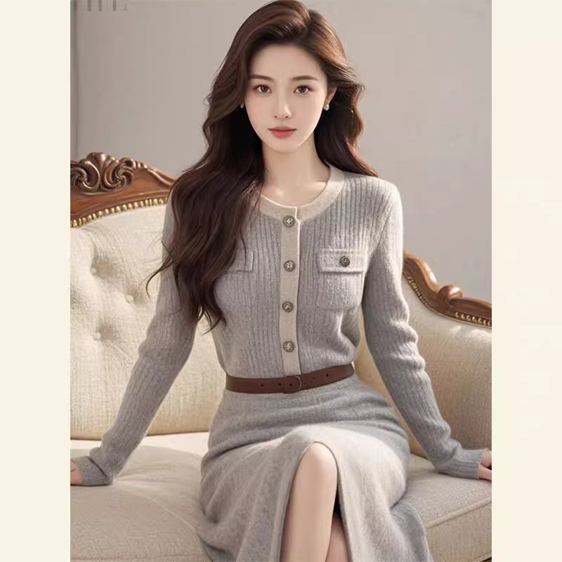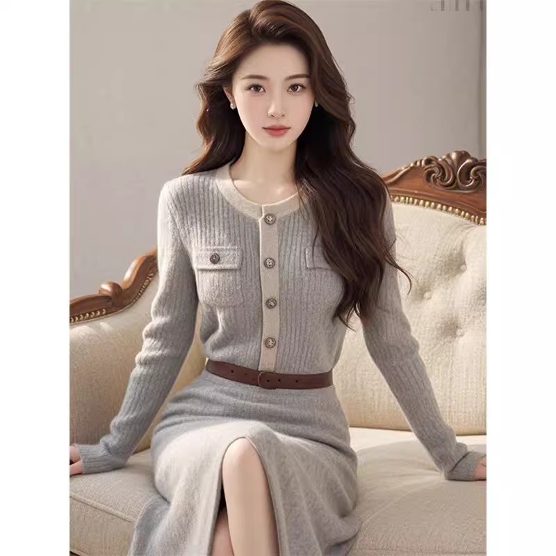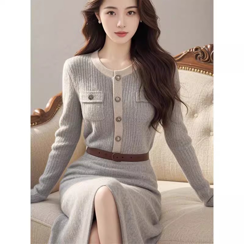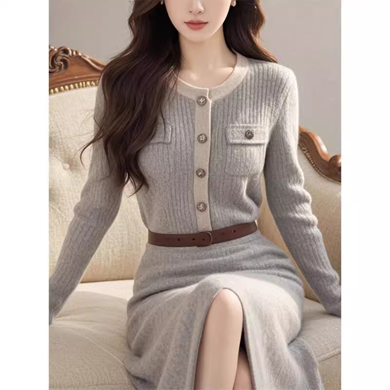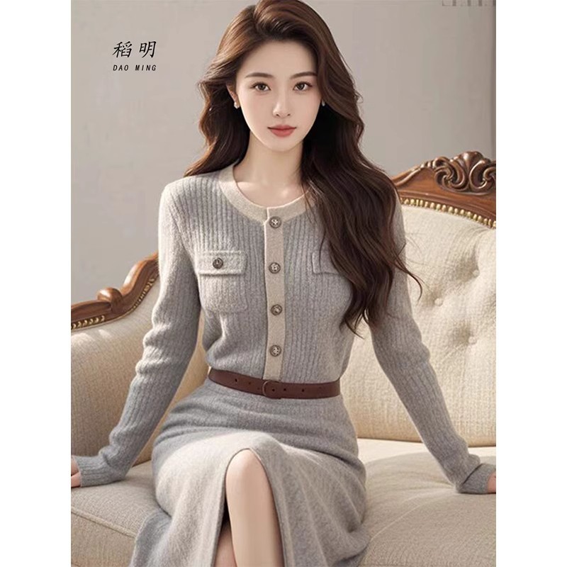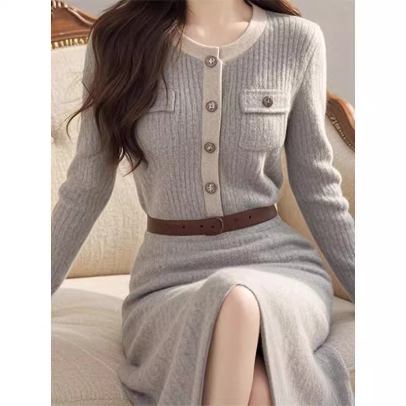 프랑스 고급 회색 긴팔 니트 원피스 여성의 가을과 겨울 2025 새로운 서양식 패션 허리 스커트스토어 가기