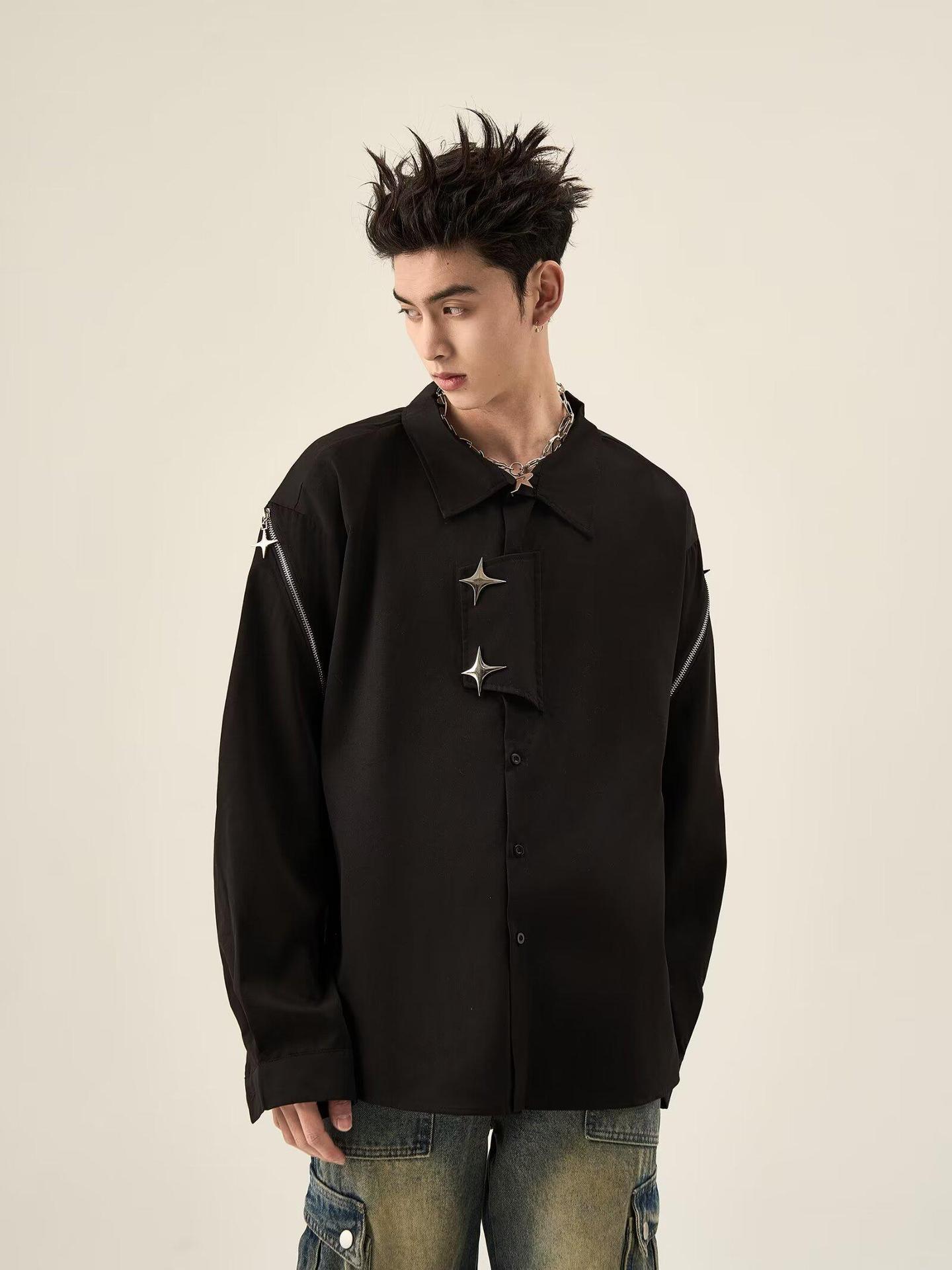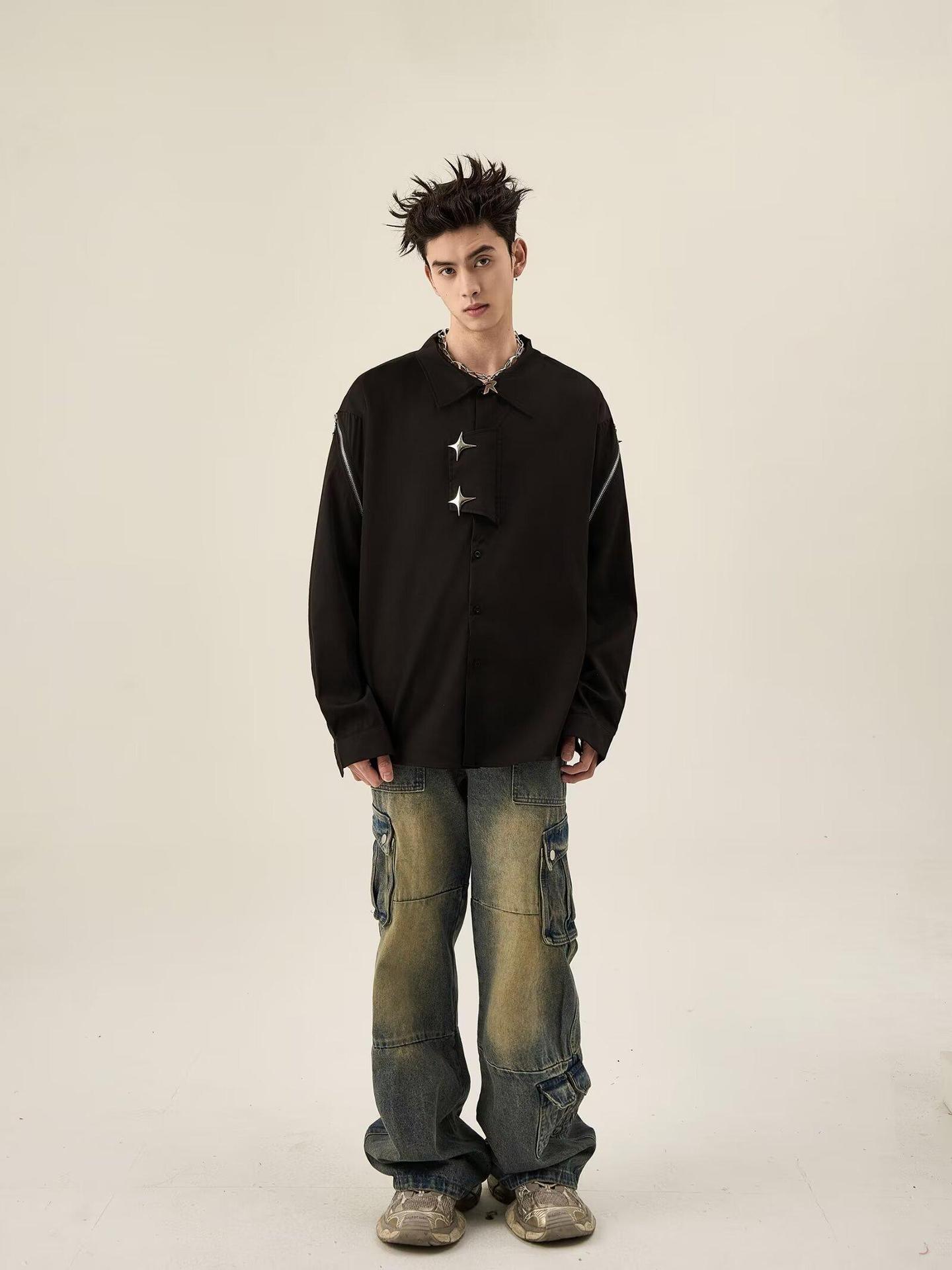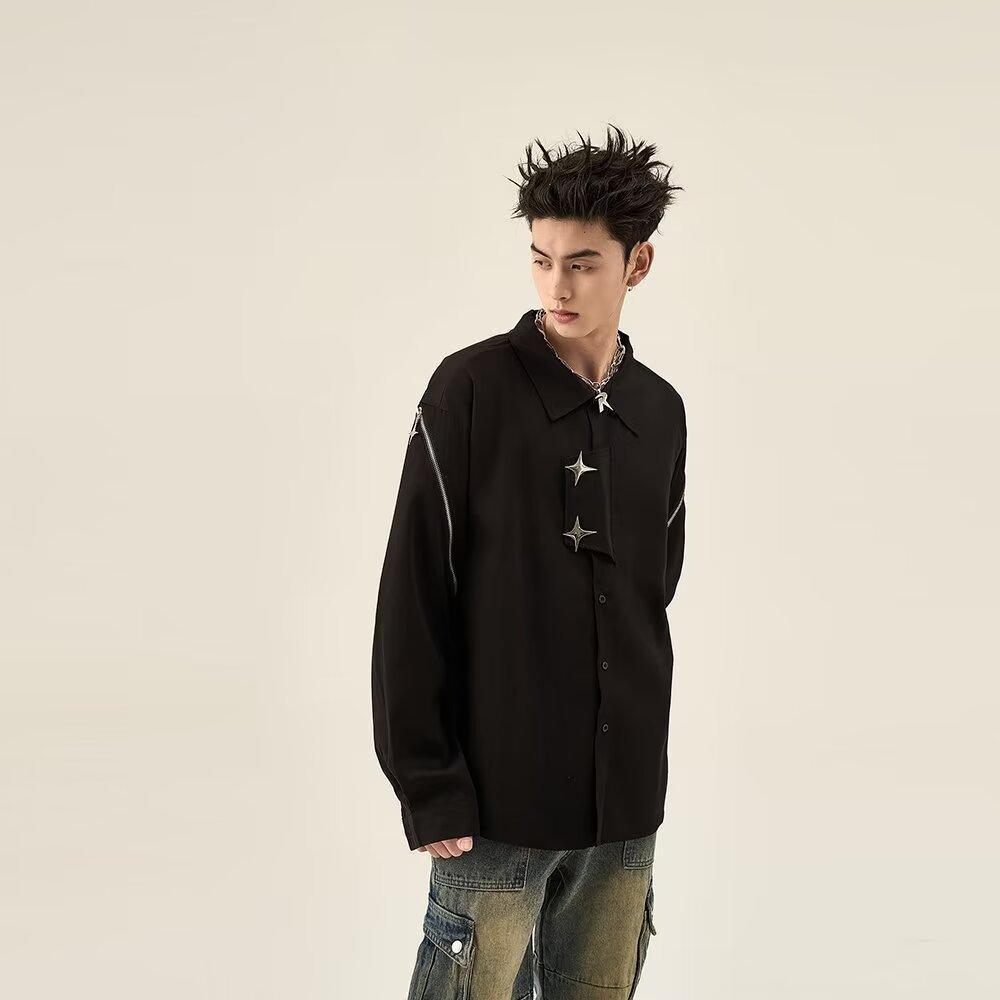 2025 새로운 홍콩 스타일 가을과 겨울 남성 긴팔 셔츠 크로스 사이드 스플릿 툴링 지퍼 코트 셔츠 도매