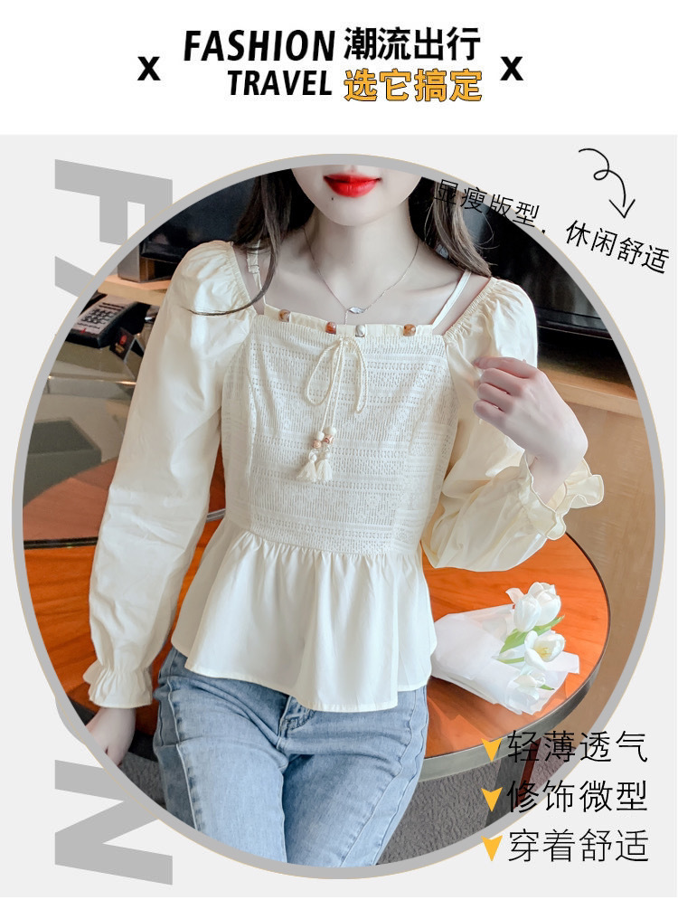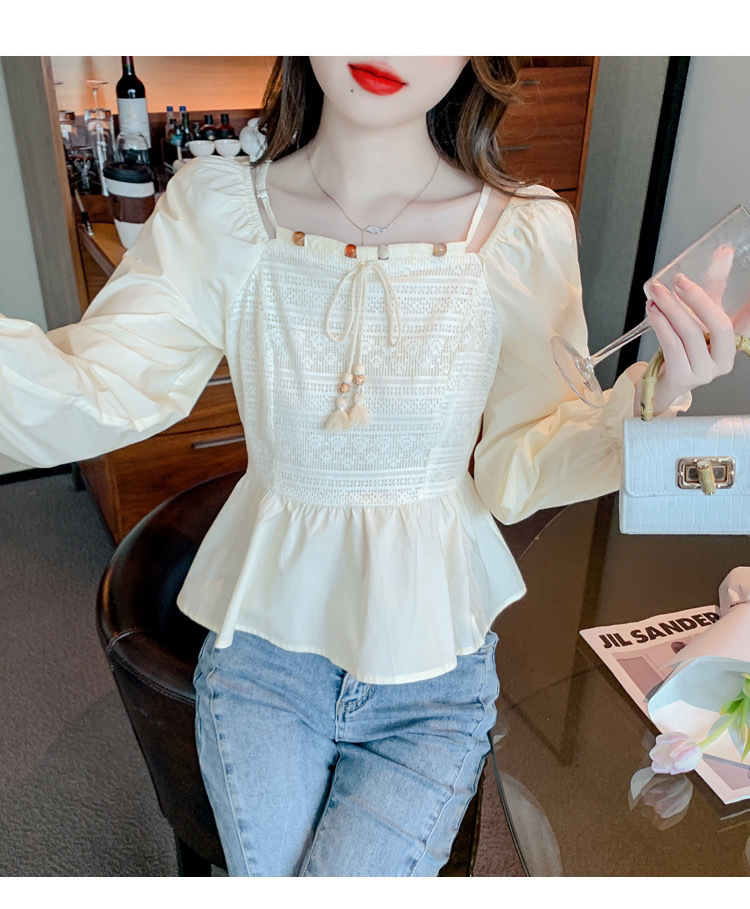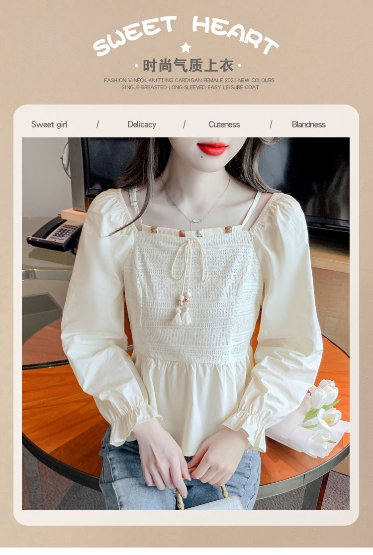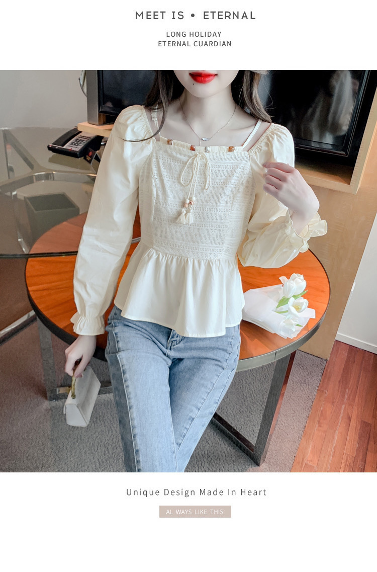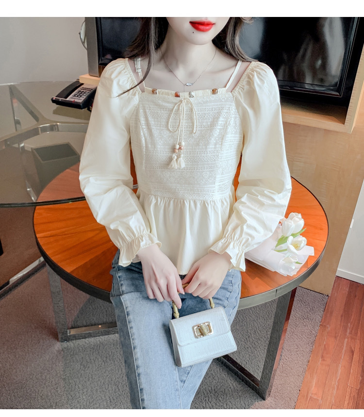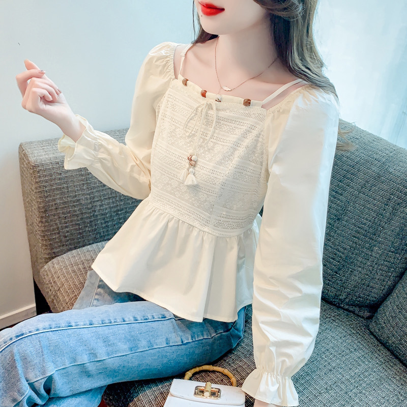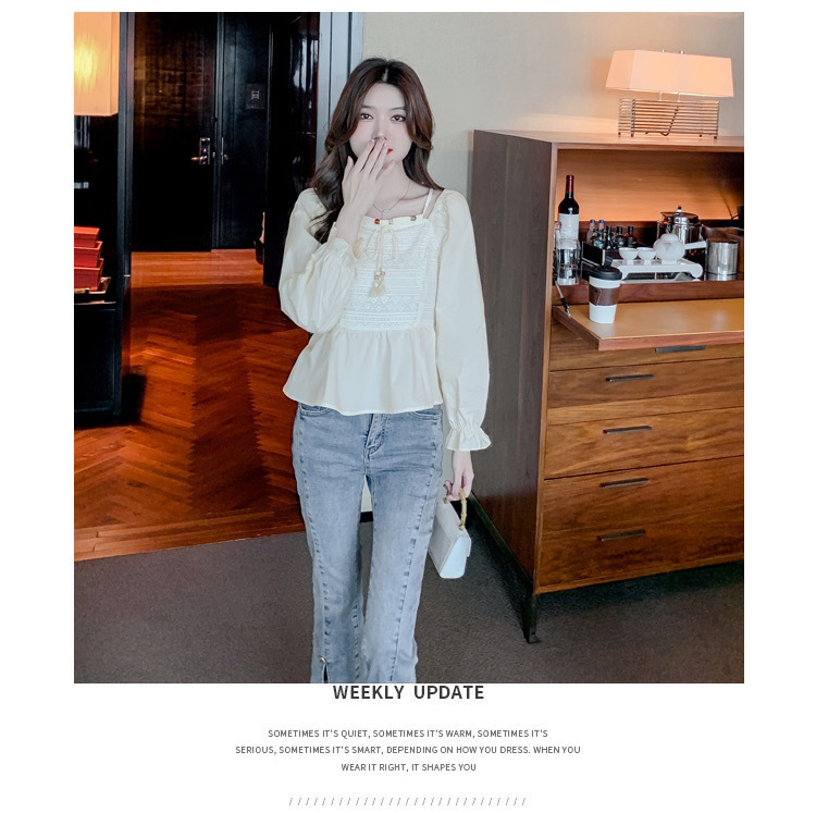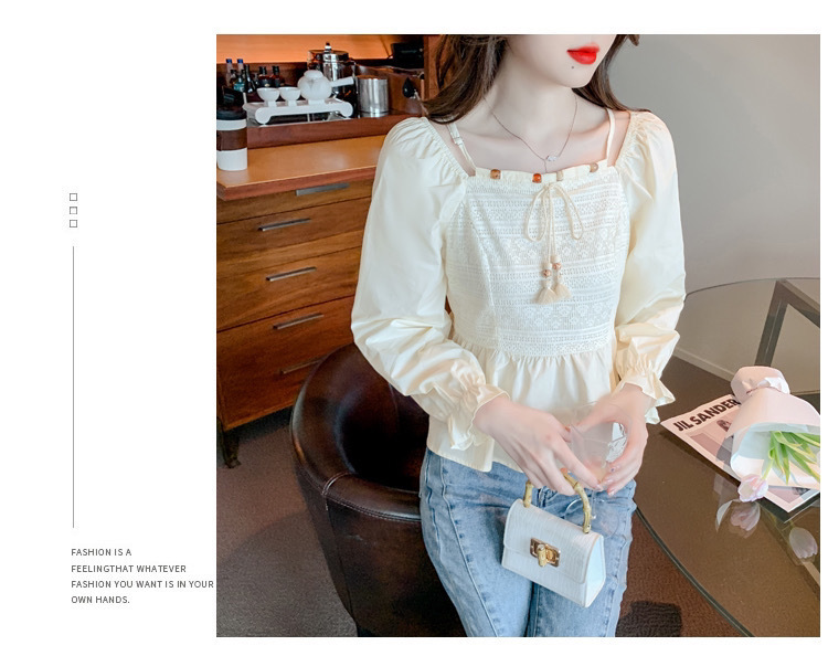 프랑스 스타일 우아한 디자인 센스 스퀘어 칼라 셔츠 여성의 가을 새로운 타이트 허리 슬리밍 혼 긴 소매 세련된 아름다운 탑
