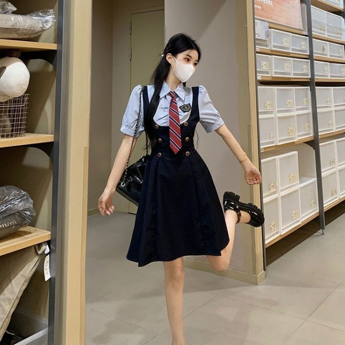 JK 대학 스타일의 유니폼 타이트 허리 슬리밍 반팔 셔츠 스트랩 원피스 투피스 세트 여성용 여름 순수 스타일 스커트스토어 가기