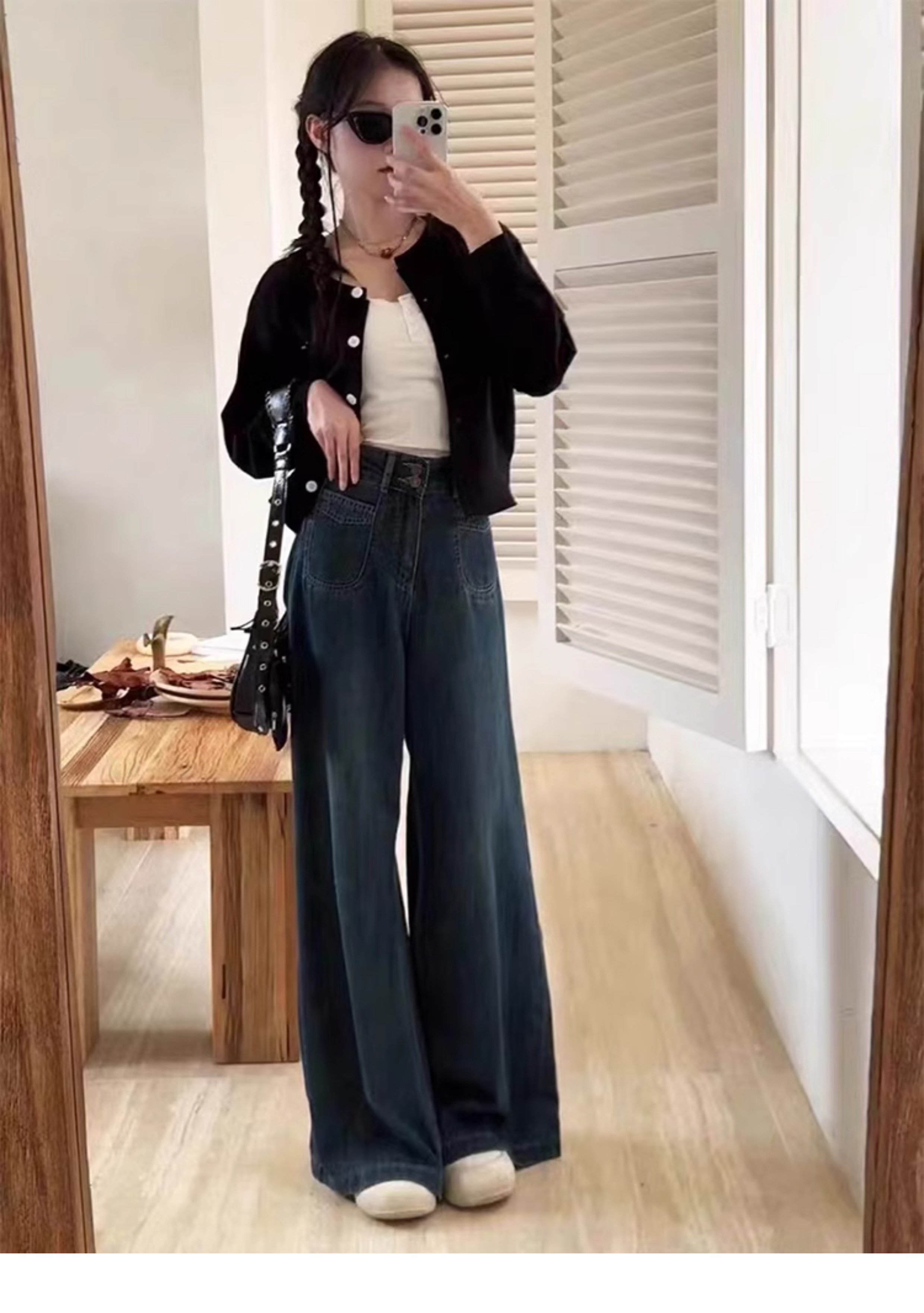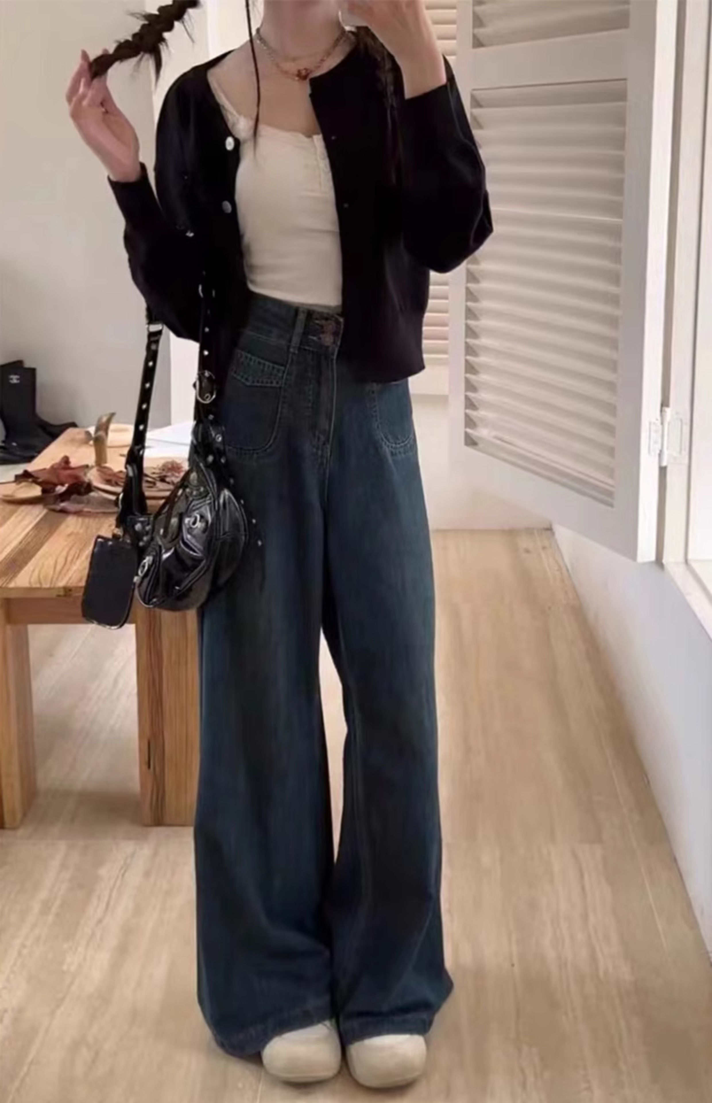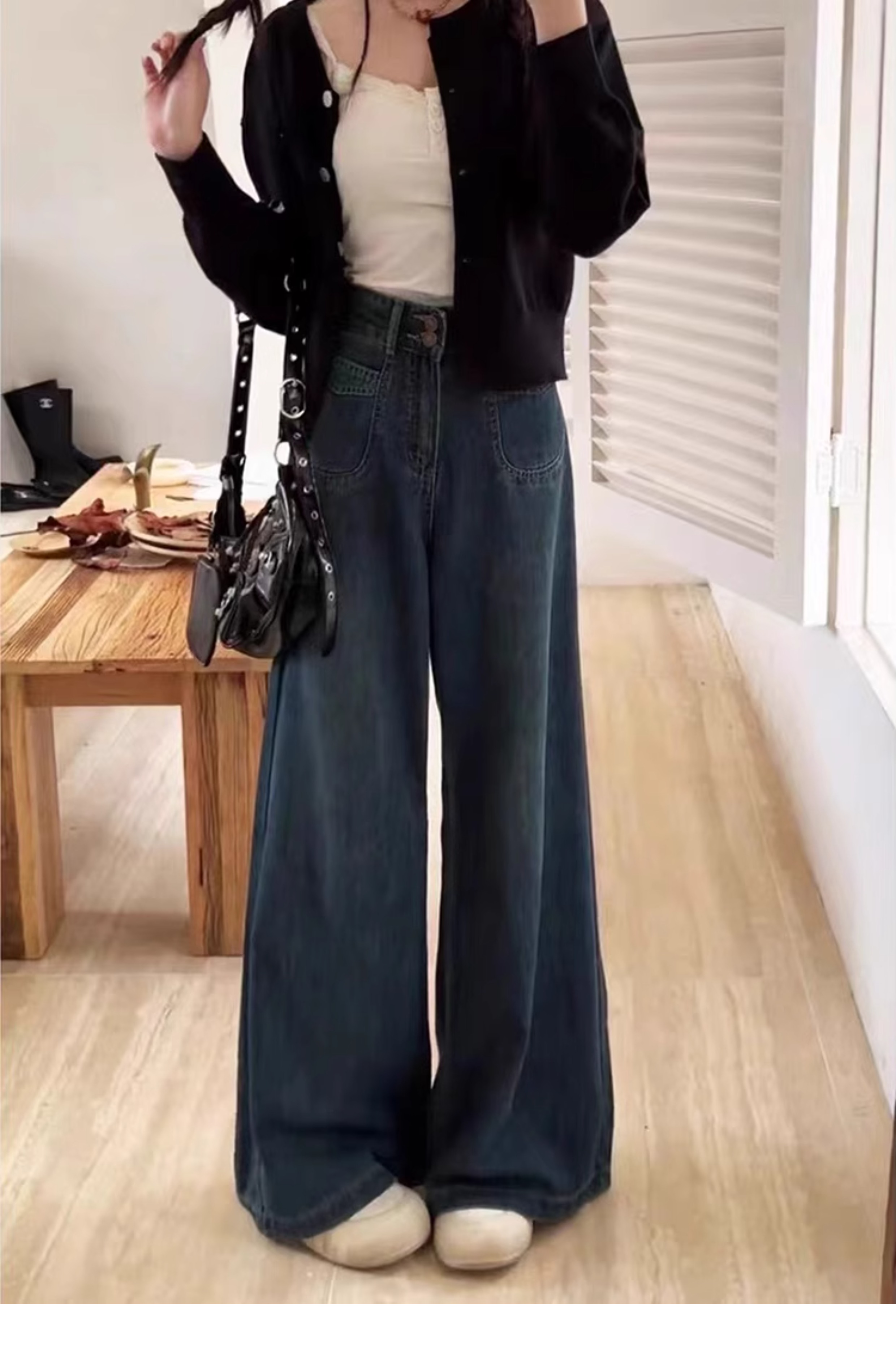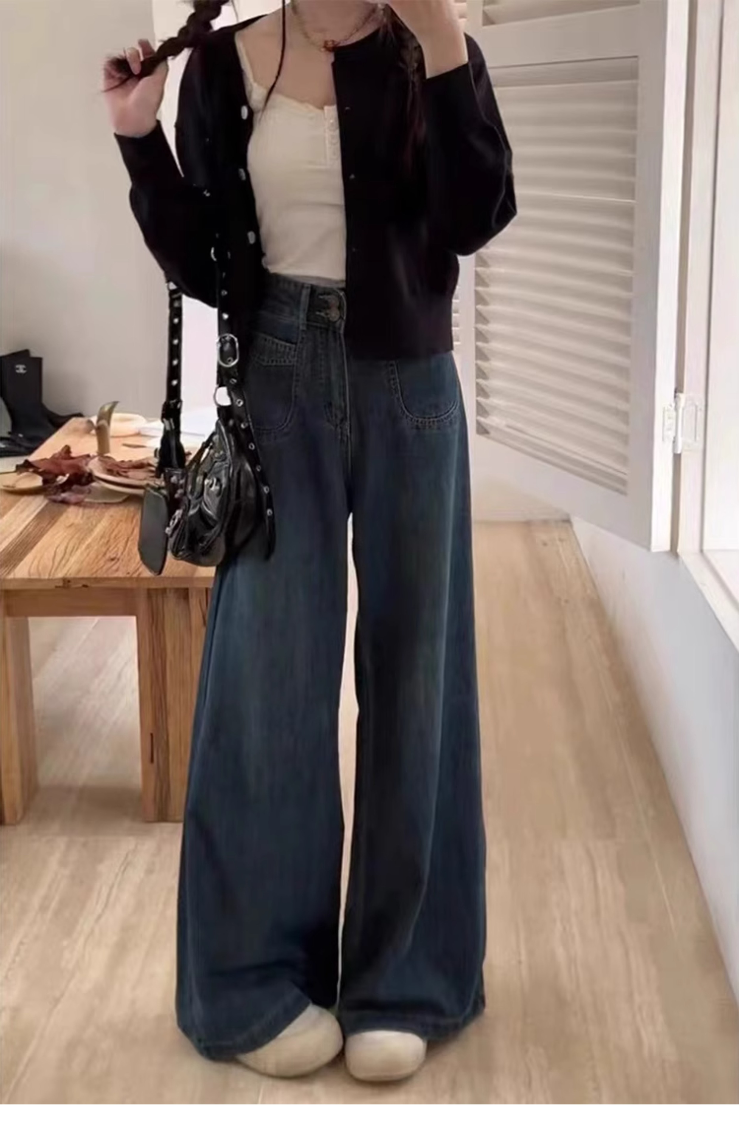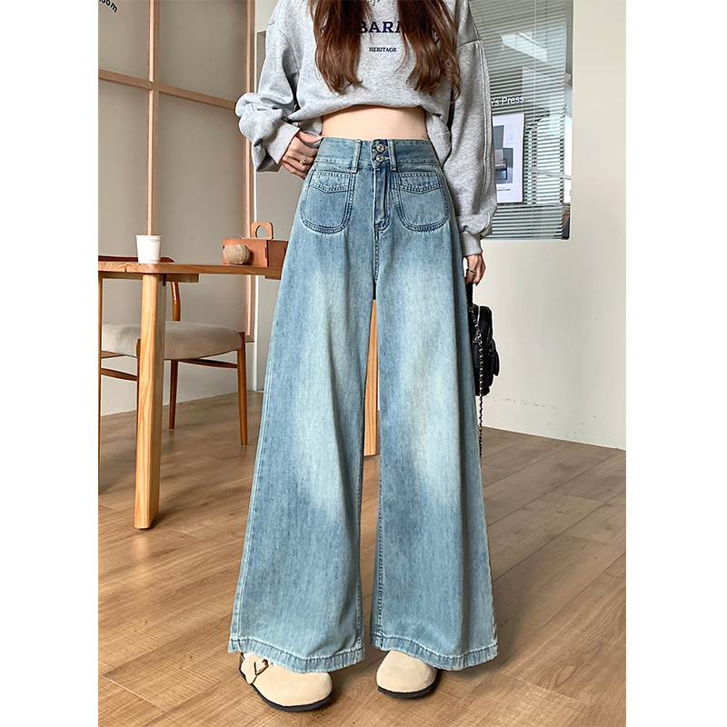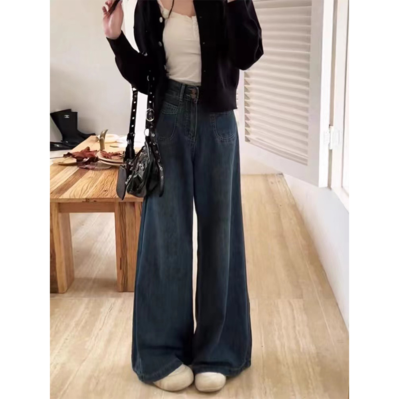 플러스 사이즈 빈티지 기모 청바지 여성의 2024 가을과 겨울 통통녀 느슨한 높은 허리 슬리밍 스트레이트 레그 와이드 레그 바지