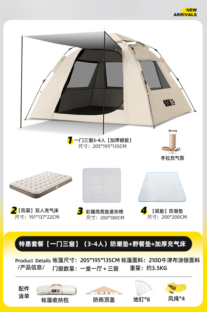 • 야간 패키지 [문 2개, 창문 2개] 비닐 스타일(3~4인)에는 방습 매트 + 피크닉 매트 + 두꺼운 공기 침대 + 공기 주입식 베개 + 캠핑 조명 패키지가 함께 제공됩니다.