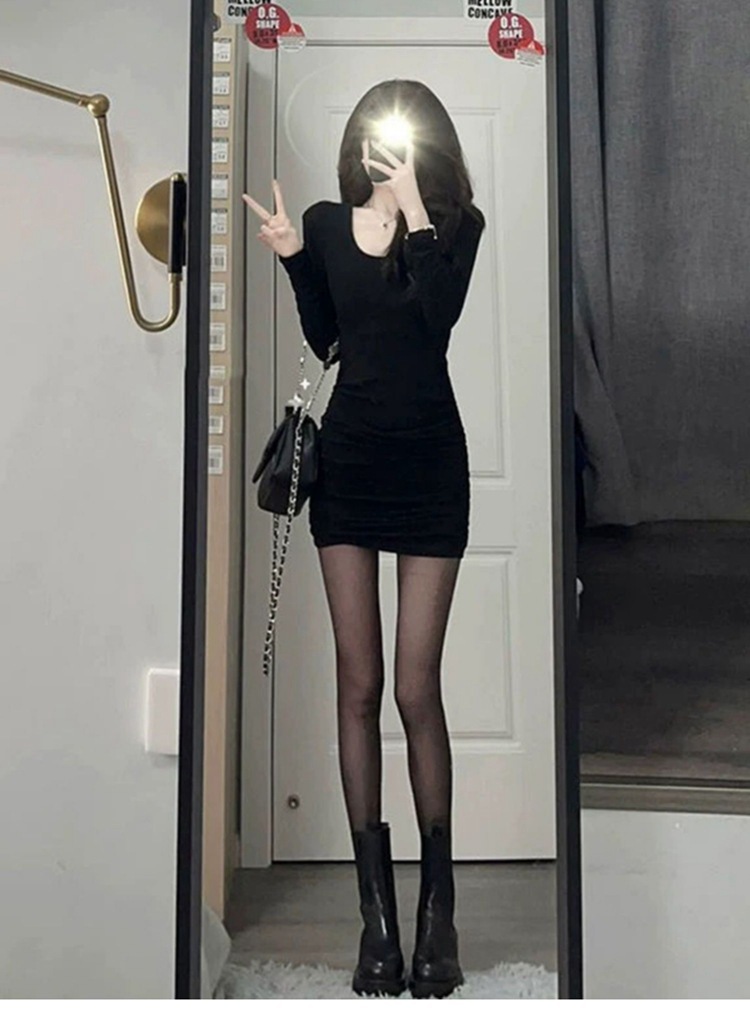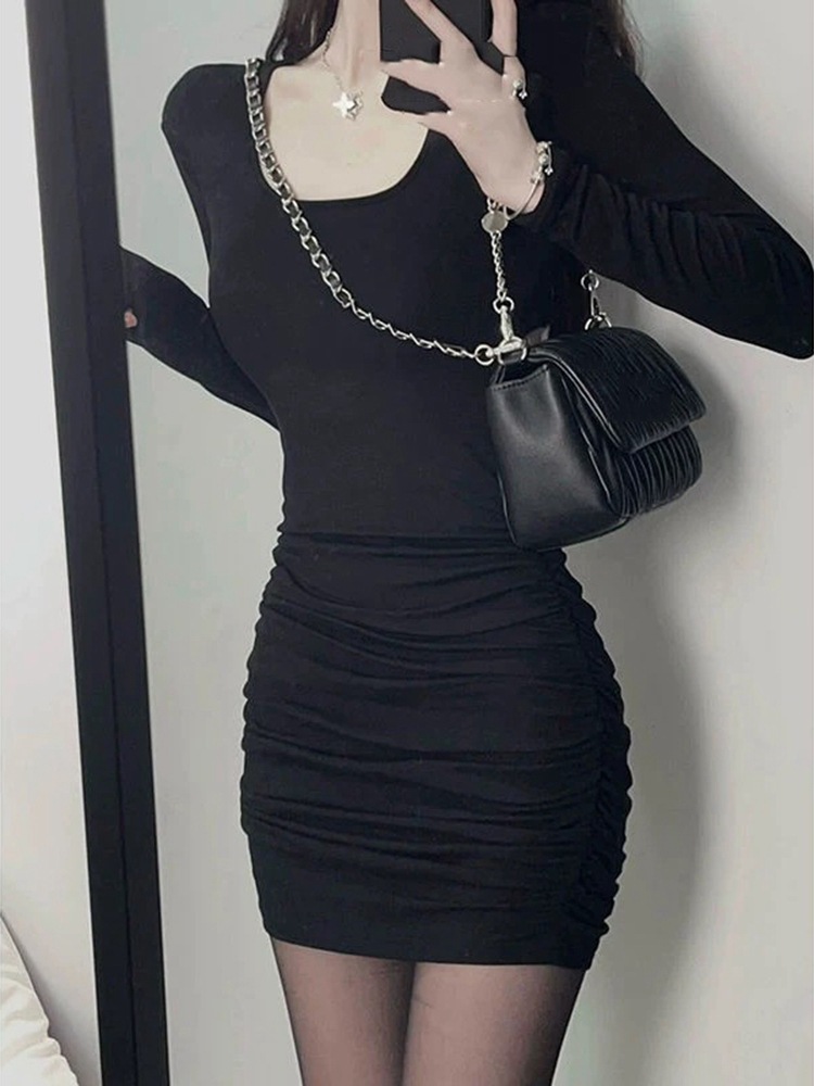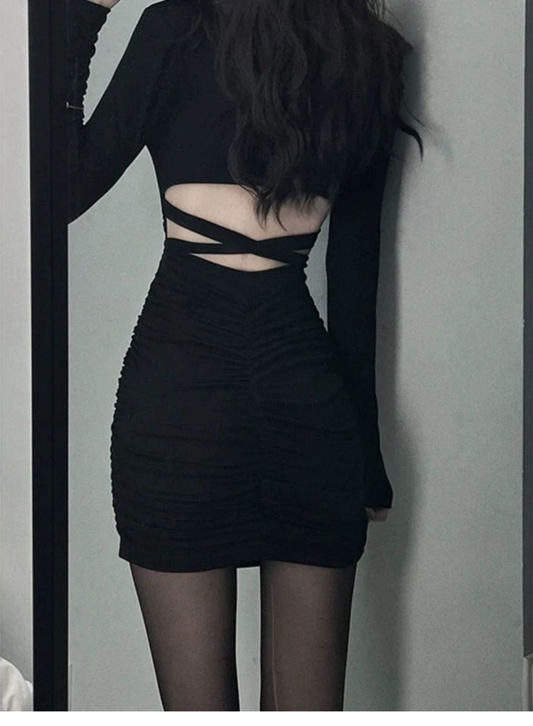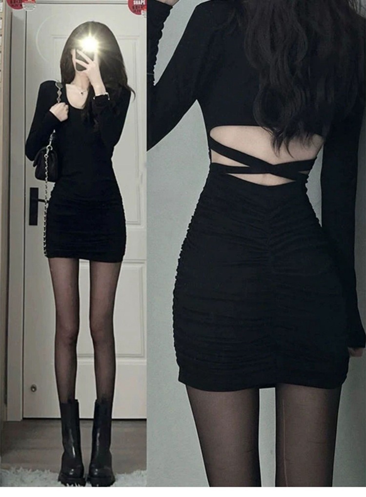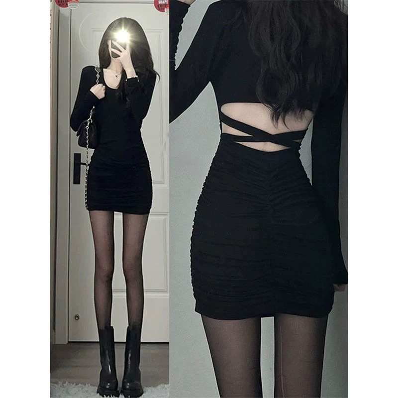 뜨거운 여자 섹시한 슬림 핏 백리스 원피스 여성 가을 작은 꽉 검은 틈새 허리 노출 디자인 힙합 스커트스토어 가기