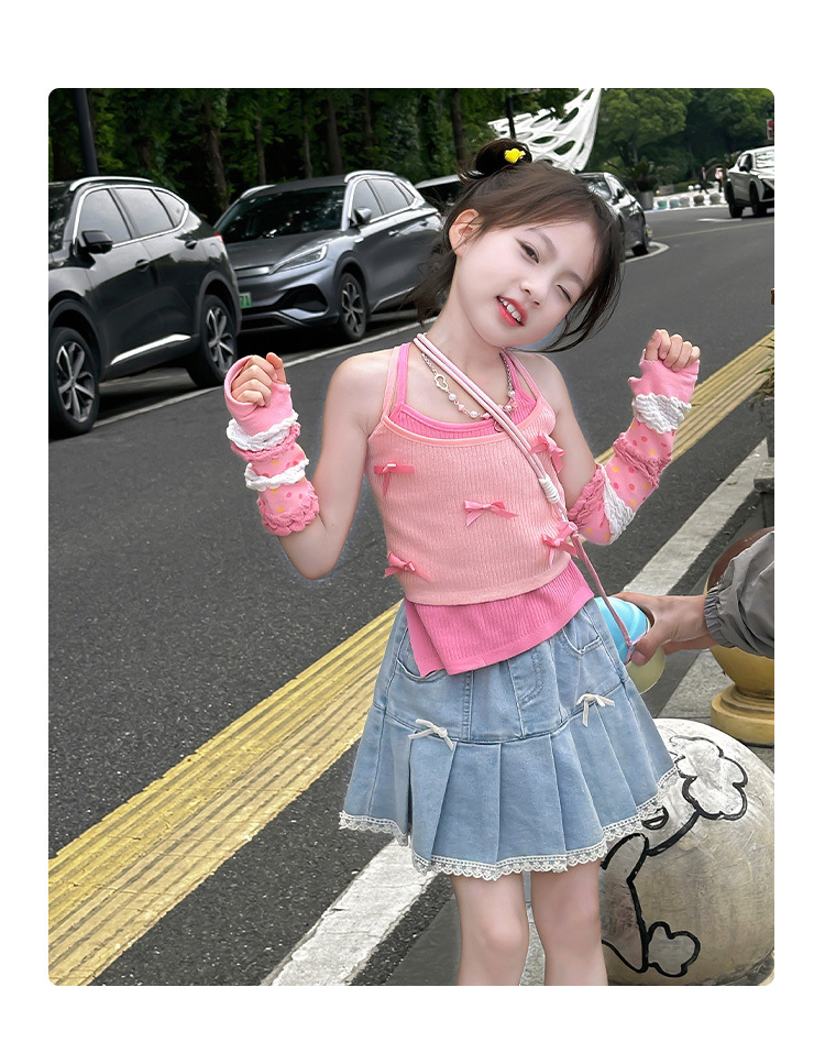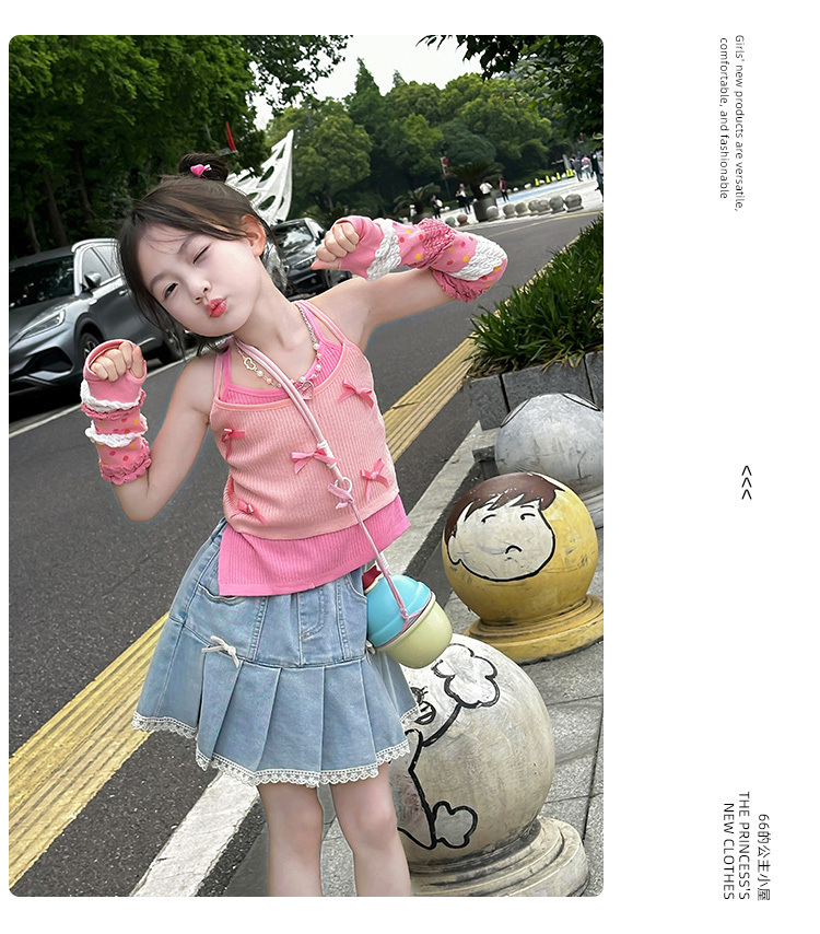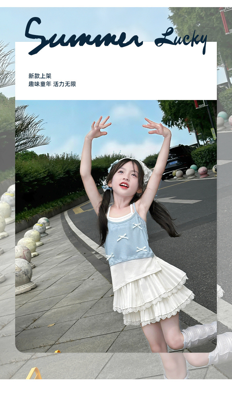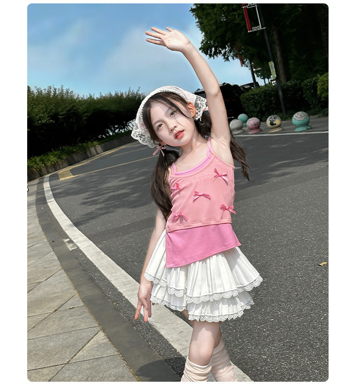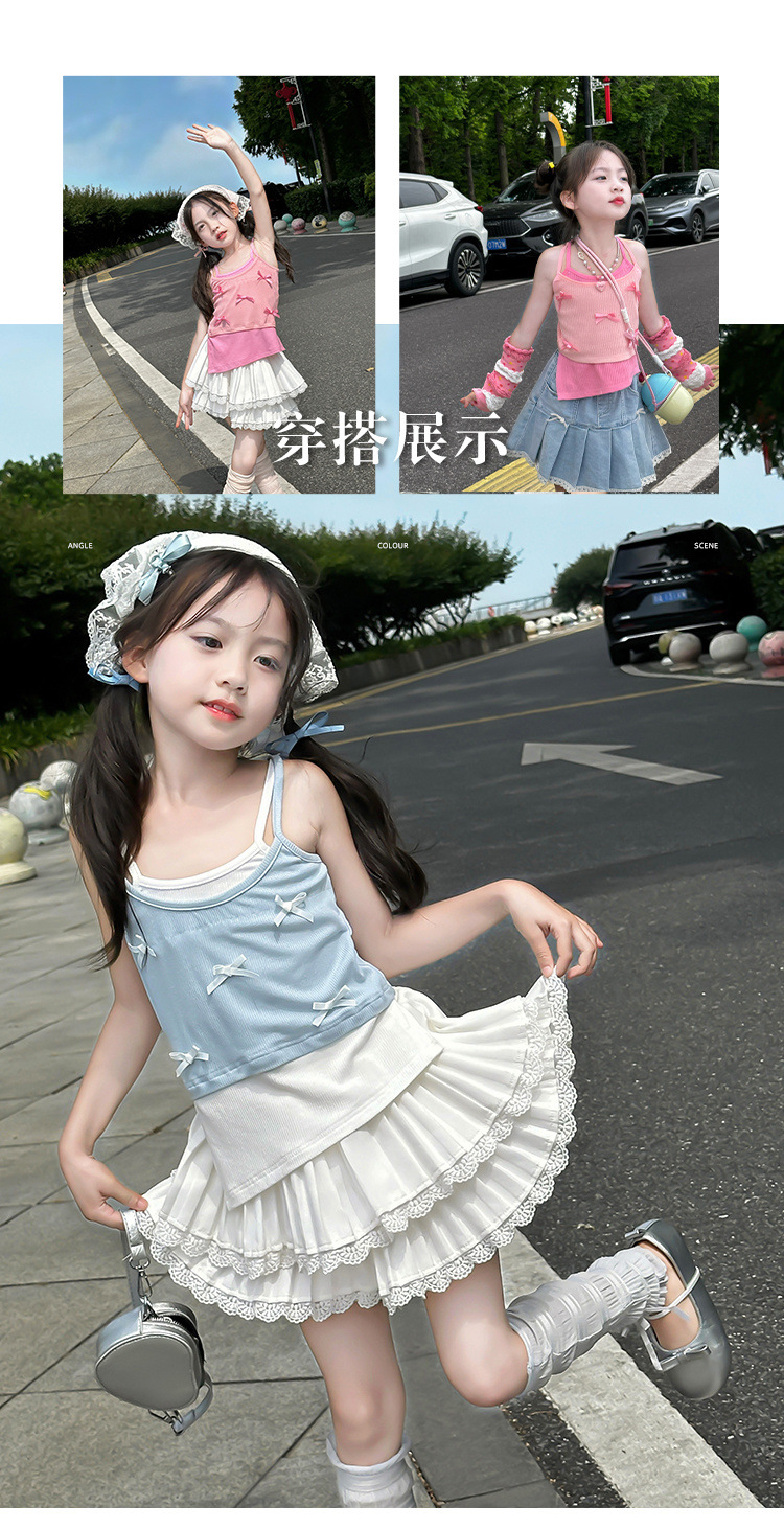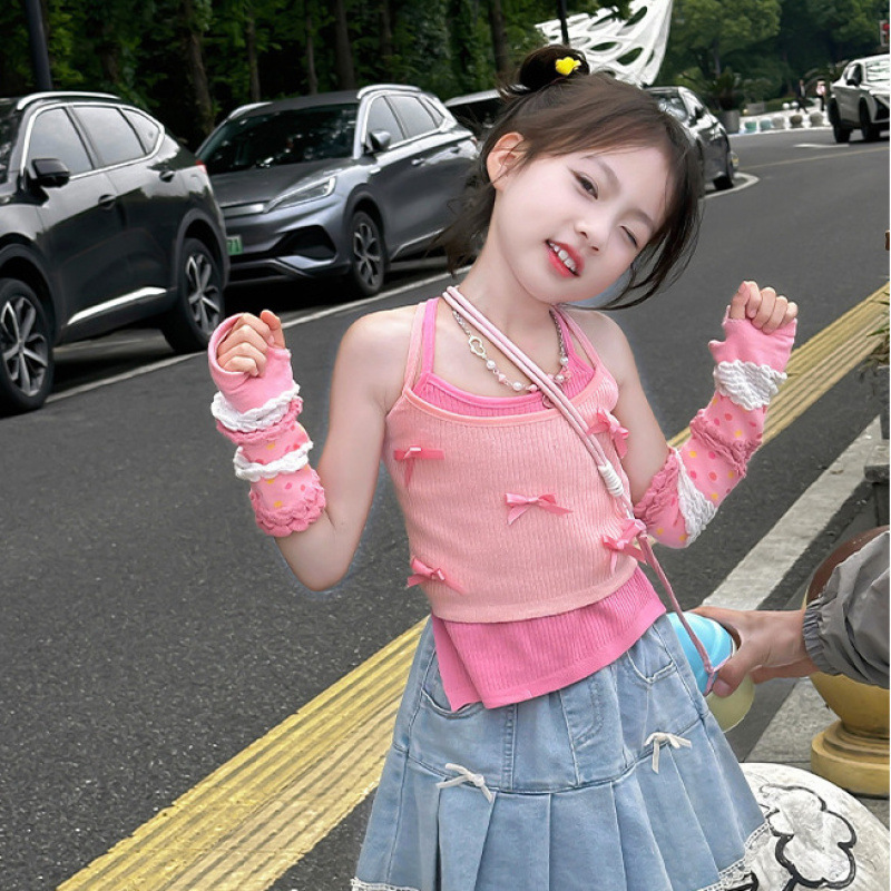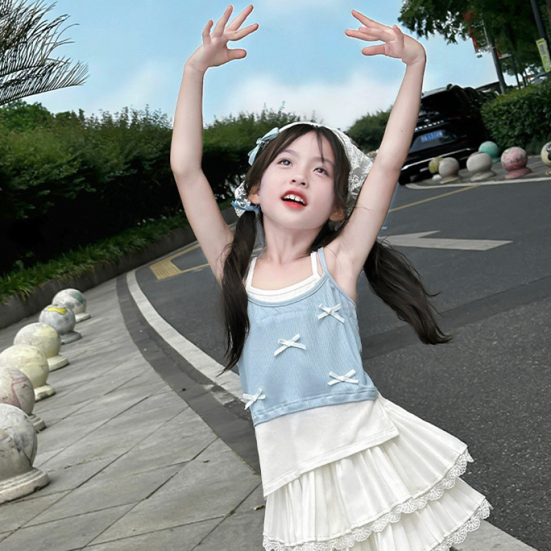 소녀 카미솔 가짜 투피스 보우 조끼 어린이 여름 2025 새로운 한국식 민소매 탑베이스 셔츠 트렌디스토어 가기
