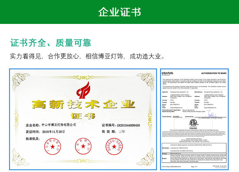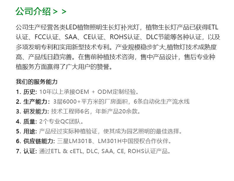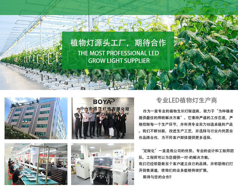 博亚灯饰|源头植物灯工厂,12年线下经验,专供欧美LED植物生长灯市场,对 植物的育苗、生长、开花、结果有非常丰富的经验,提供各种光谱、功率的定制解 决方案。公司已通过ISO9001/ETL/CE/FCC/ROHS/DLC/SAA等各种质量管理体系及产品认证。