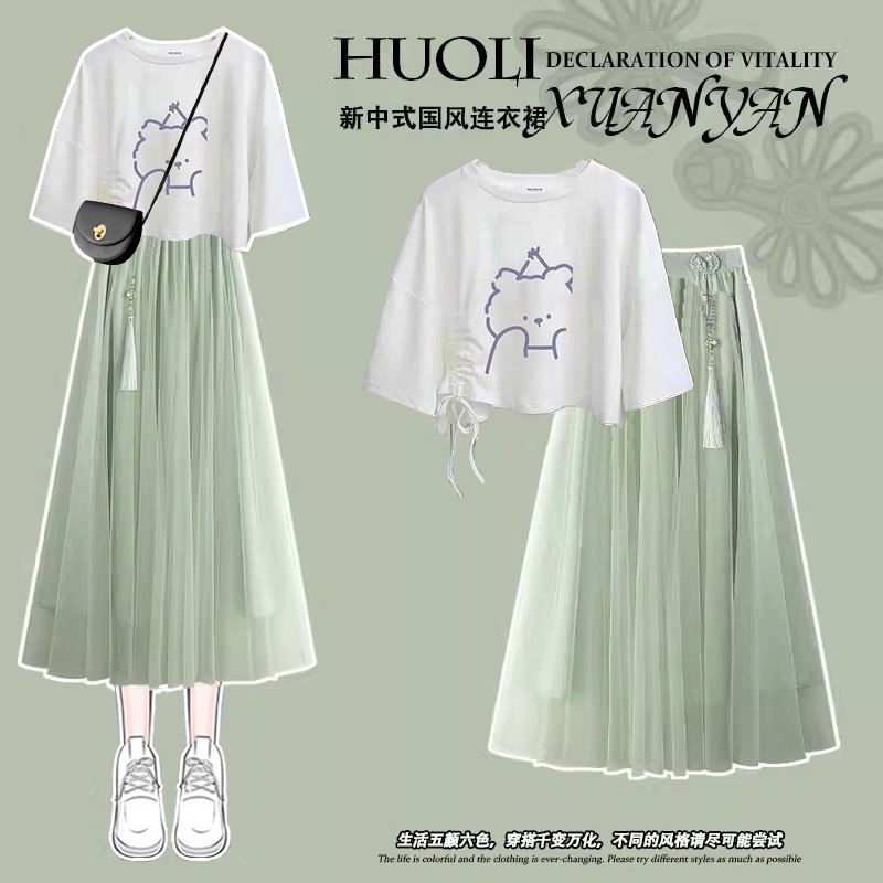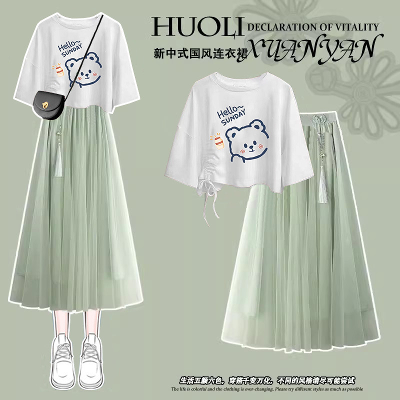 • 귀여운 곰 티셔츠 + 중국식 거즈 스커트 8548#