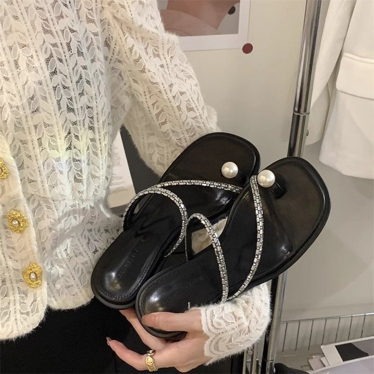 페어리 스타일 두꺼운 힐 세트 발가락 진주 샌들 여성 복장 2025 여름 새로운 도착 속편 미들 힐 로마 통 샌들스토어 가기