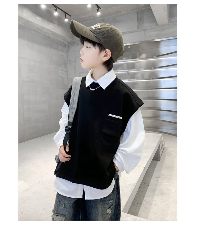 소년 셔츠 조끼 캐주얼 투피스 2025 새로운 스타일 큰 어린이 봄 옷 소년의 트렌디 한 브랜드 프라이드 스트리트 스웨트 셔츠 탑스토어 가기