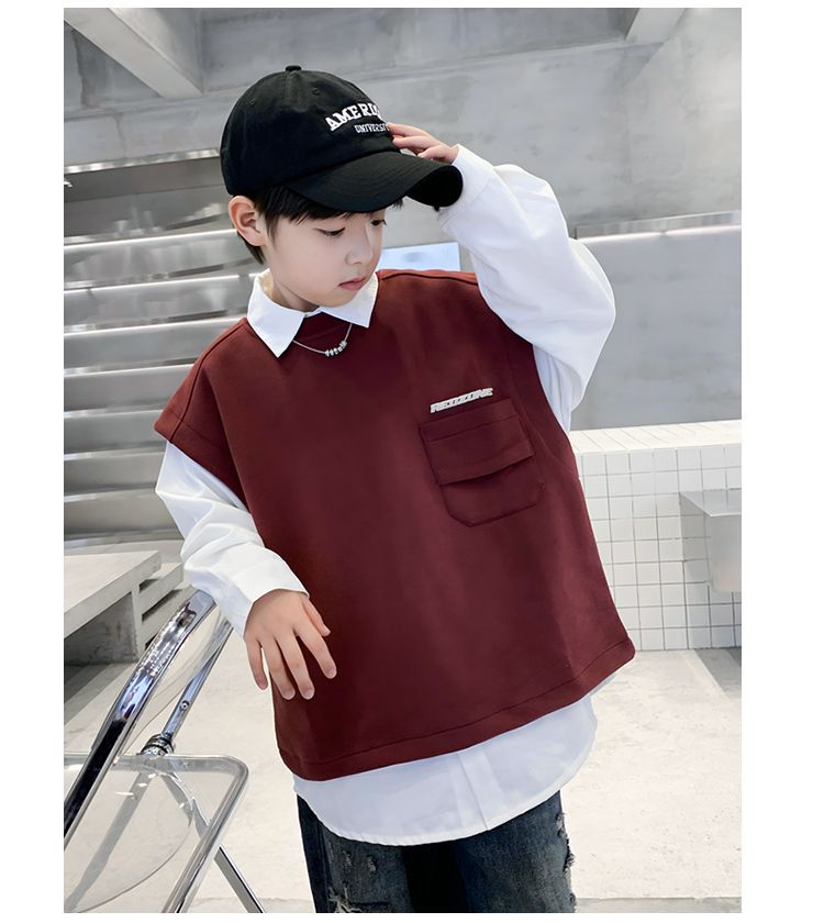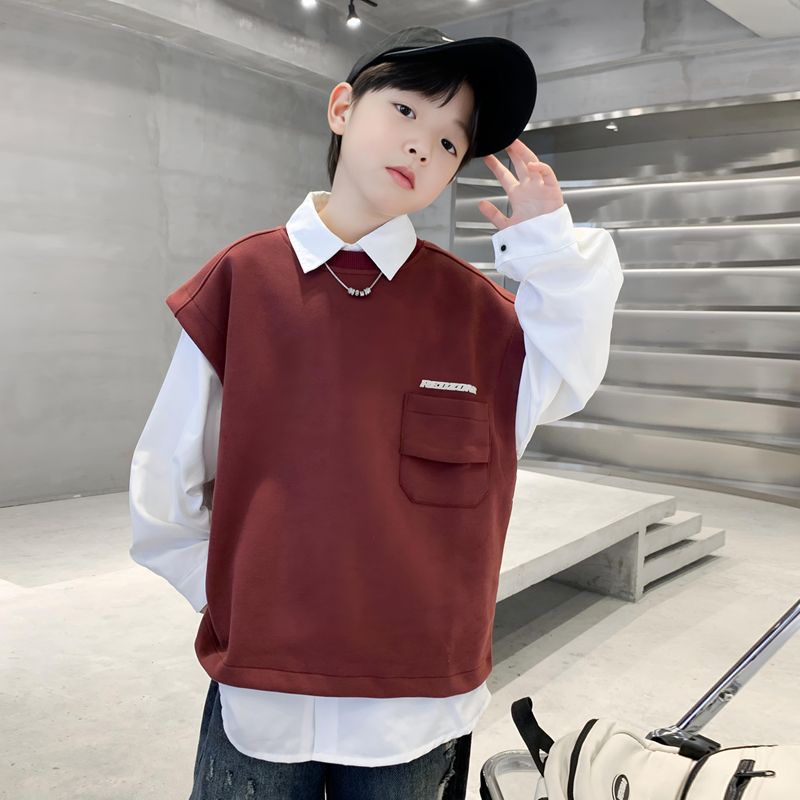 소년 셔츠 조끼 캐주얼 투피스 2025 새로운 스타일 큰 어린이 봄 옷 소년의 트렌디 한 브랜드 프라이드 스트리트 스웨트 셔츠 탑