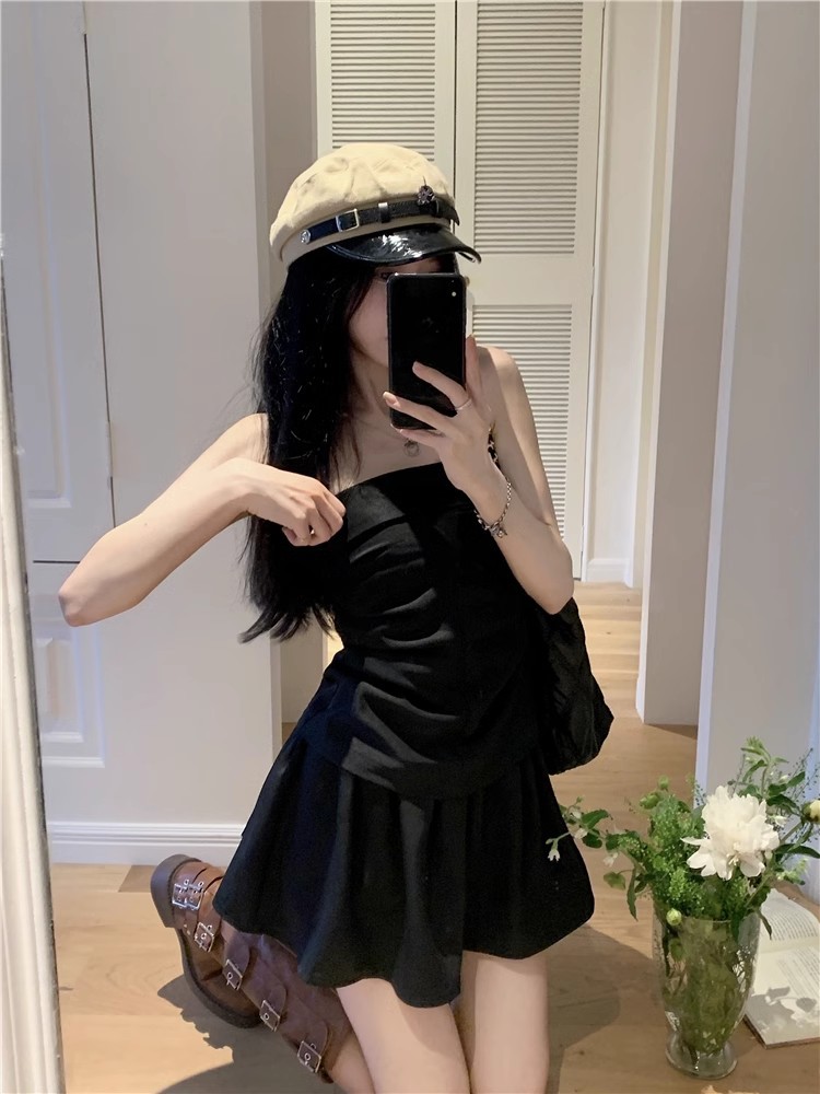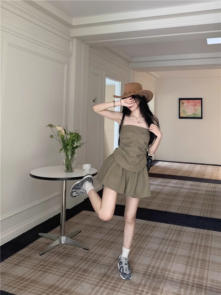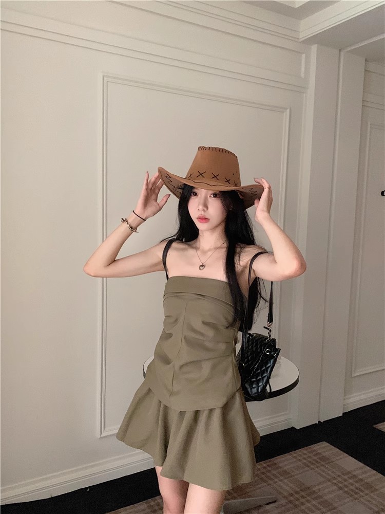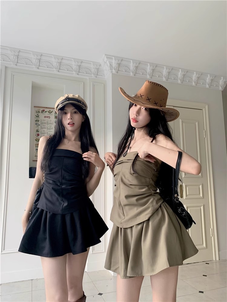 달콤한 향신료 소녀 세트 여성 틈새 디자인 감각 끈없는 조끼 여름 최고 높은 허리 짧은 치마 하프 길이 스커트 투피스 세트