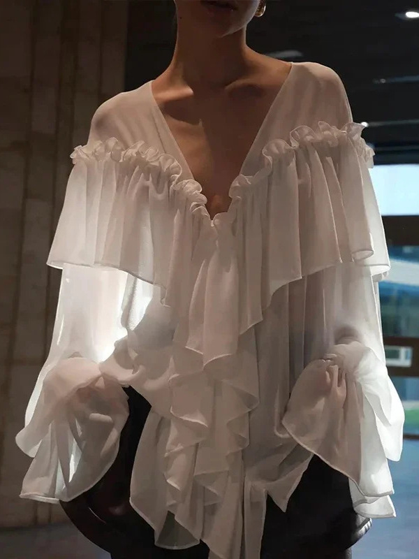 국경 간 유럽과 미국 아마존 대외 무역 2025 여름 V-넥 쉬폰 셔츠 섹시한 관점 비치 블라우스 긴 소매 탑스토어 가기